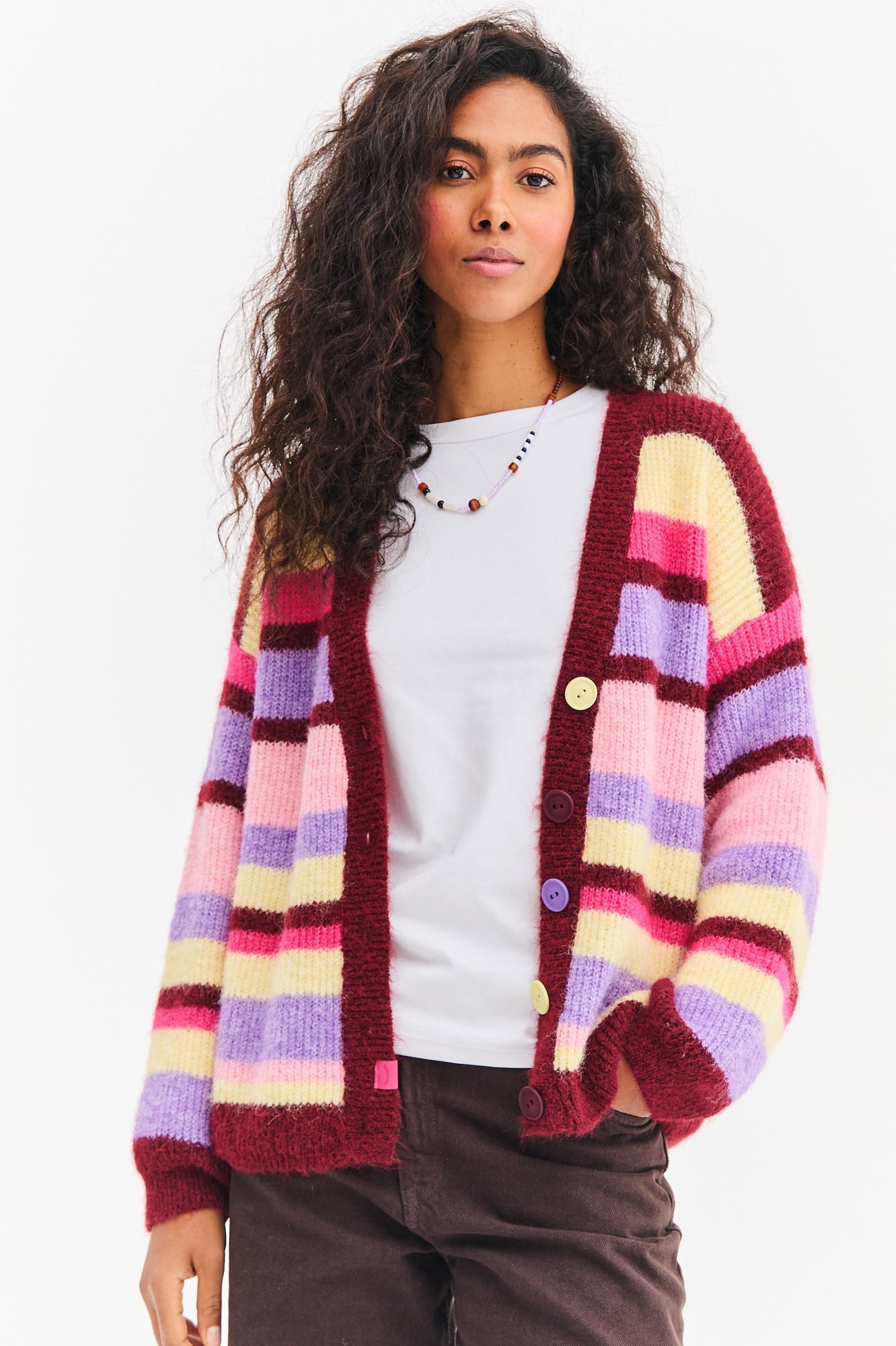 Color Spell cardigan is an offering from our fabulous collection that proves autumn doesn't have to be gray. This button-down sweater combines intense colors in a bold horizontal pattern. The deep maroon of the piping and neckline beautifully closes the composition.