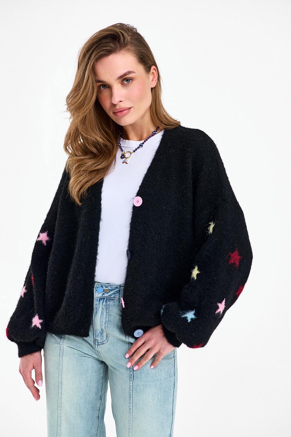 Under Dark Sky Cardigan brings the magic of the night sky to your wardrobe. This soft black sweater is adorned with a row of pastel-colored stars (blue, pink, yellow) running along the sleeves. Buttons in matching colors are a detail that brings the whole piece together in a joyful composition.