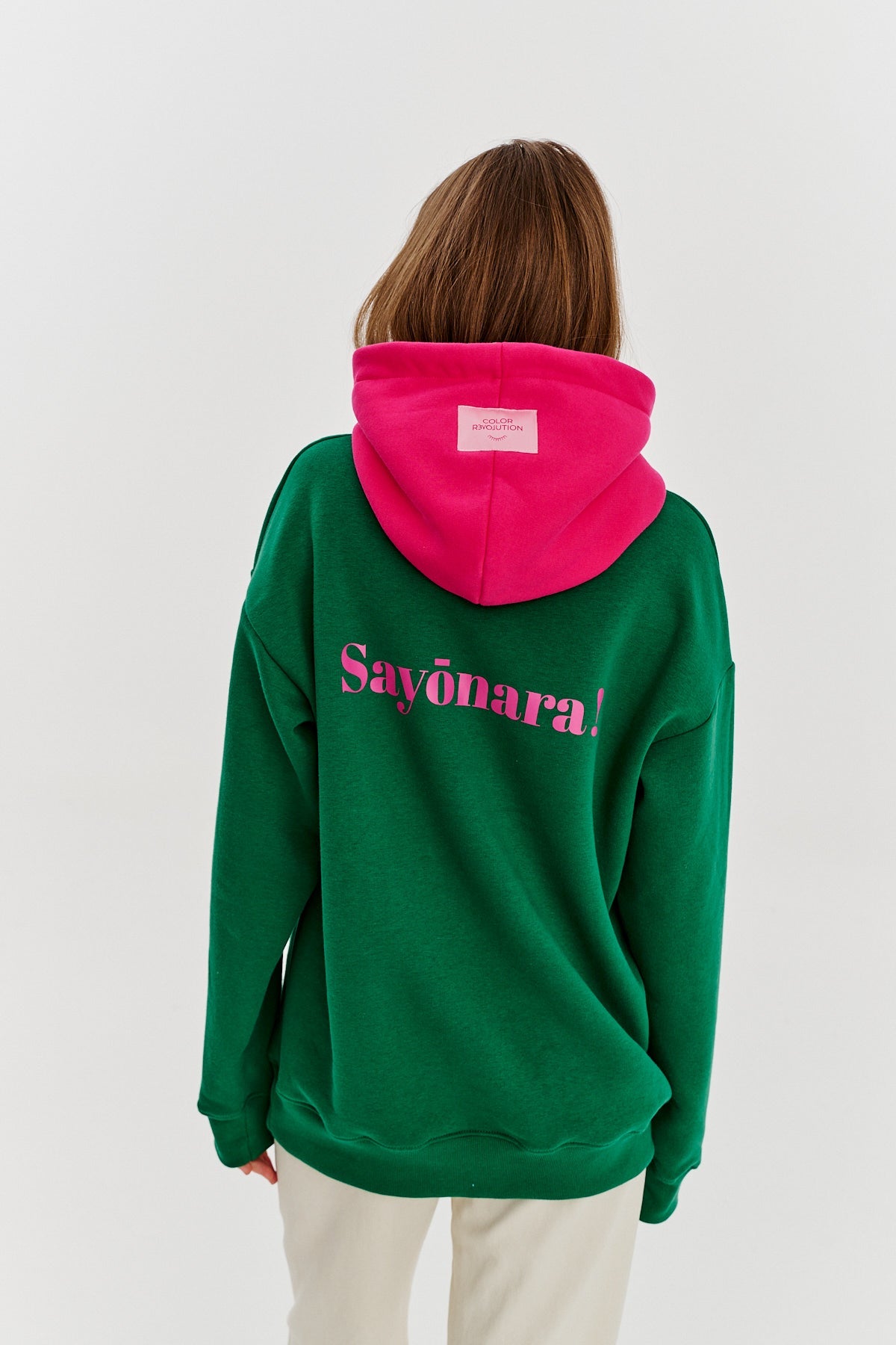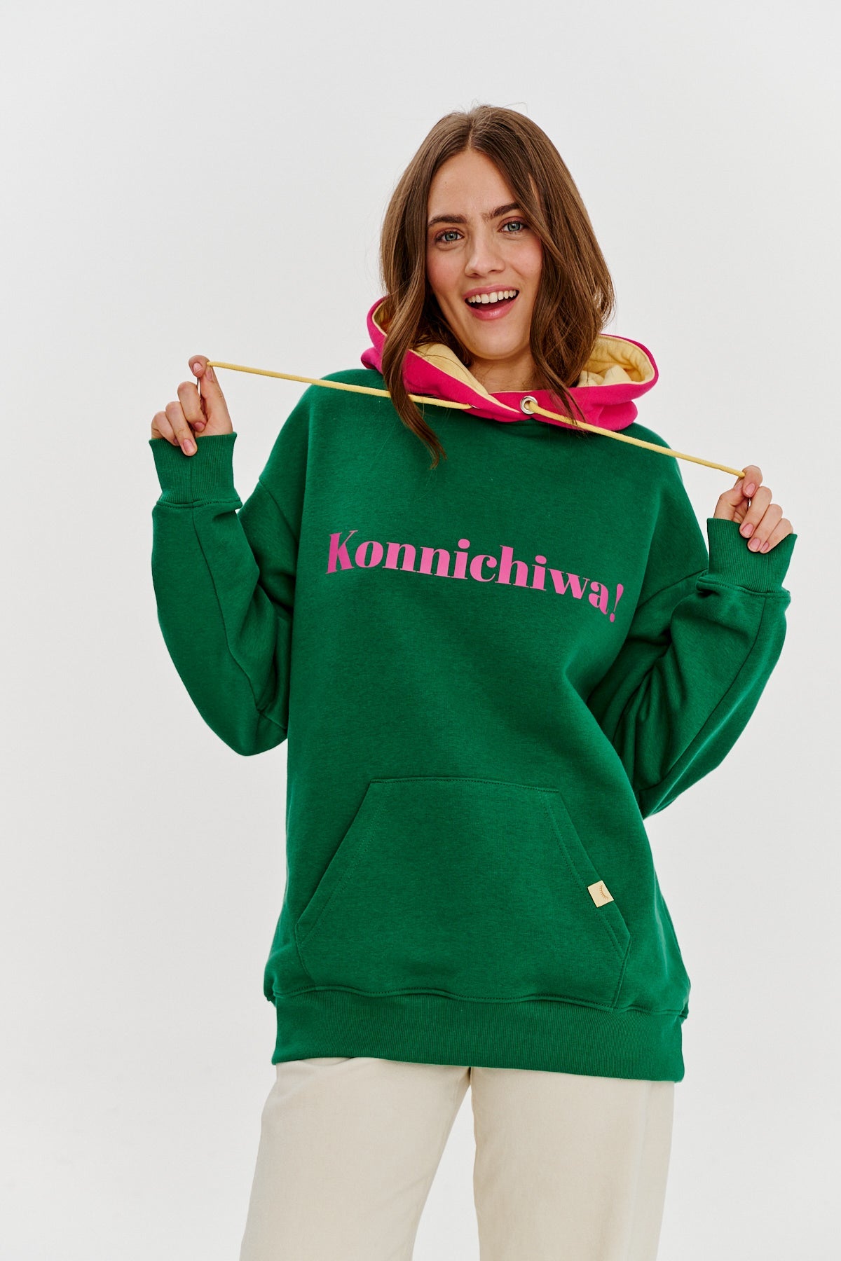 Konnichiwa hoodie is an eye-catching design that exudes positive energy. Deep green meets intense pink here, creating a distinctive and dynamic combination. The front greets you with a cheerful Konnichiwa! and the back says goodbye with a stylish Sayonara!, highlighting the playful contrast.