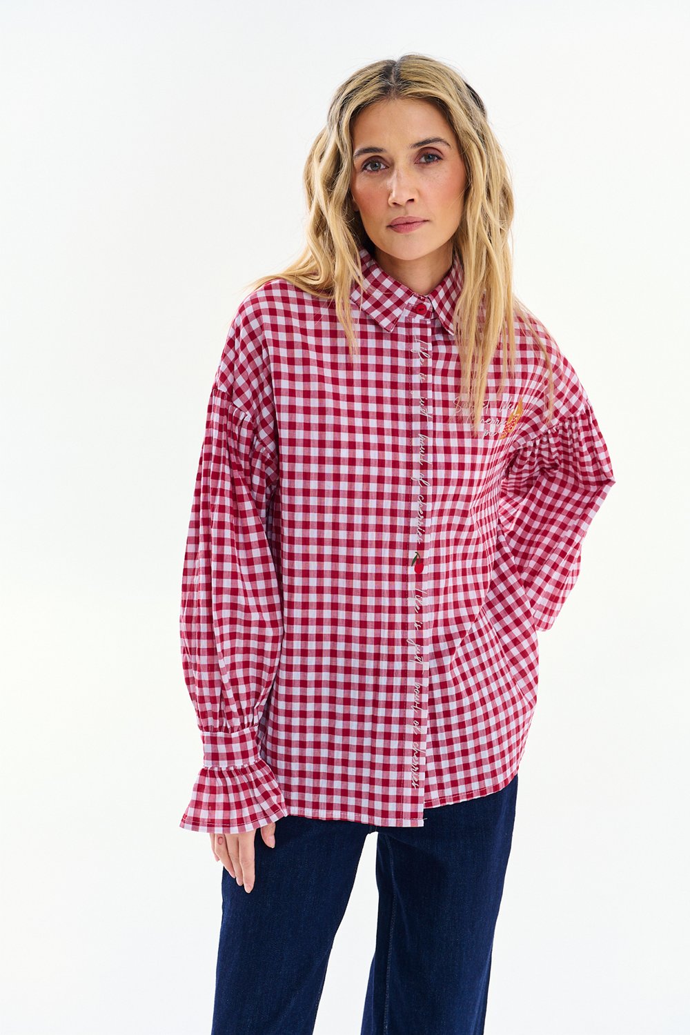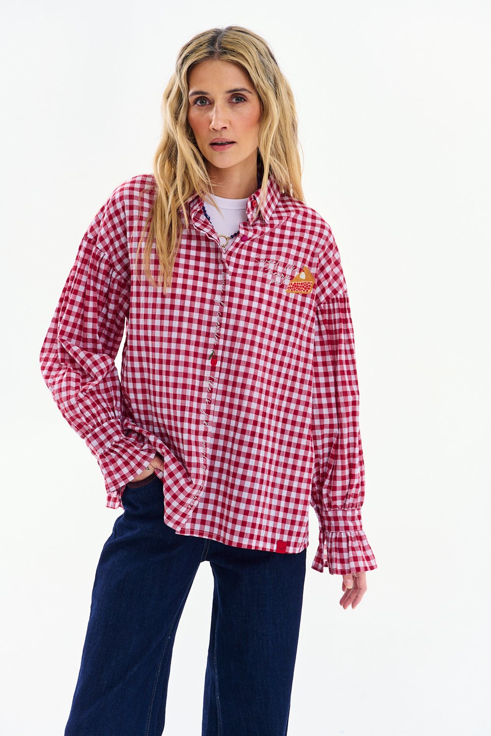 The Cherry Pie Shirt catches the eye with its classic red and white checkered pattern. Embroidered motifs give it a unique, nostalgic charm.