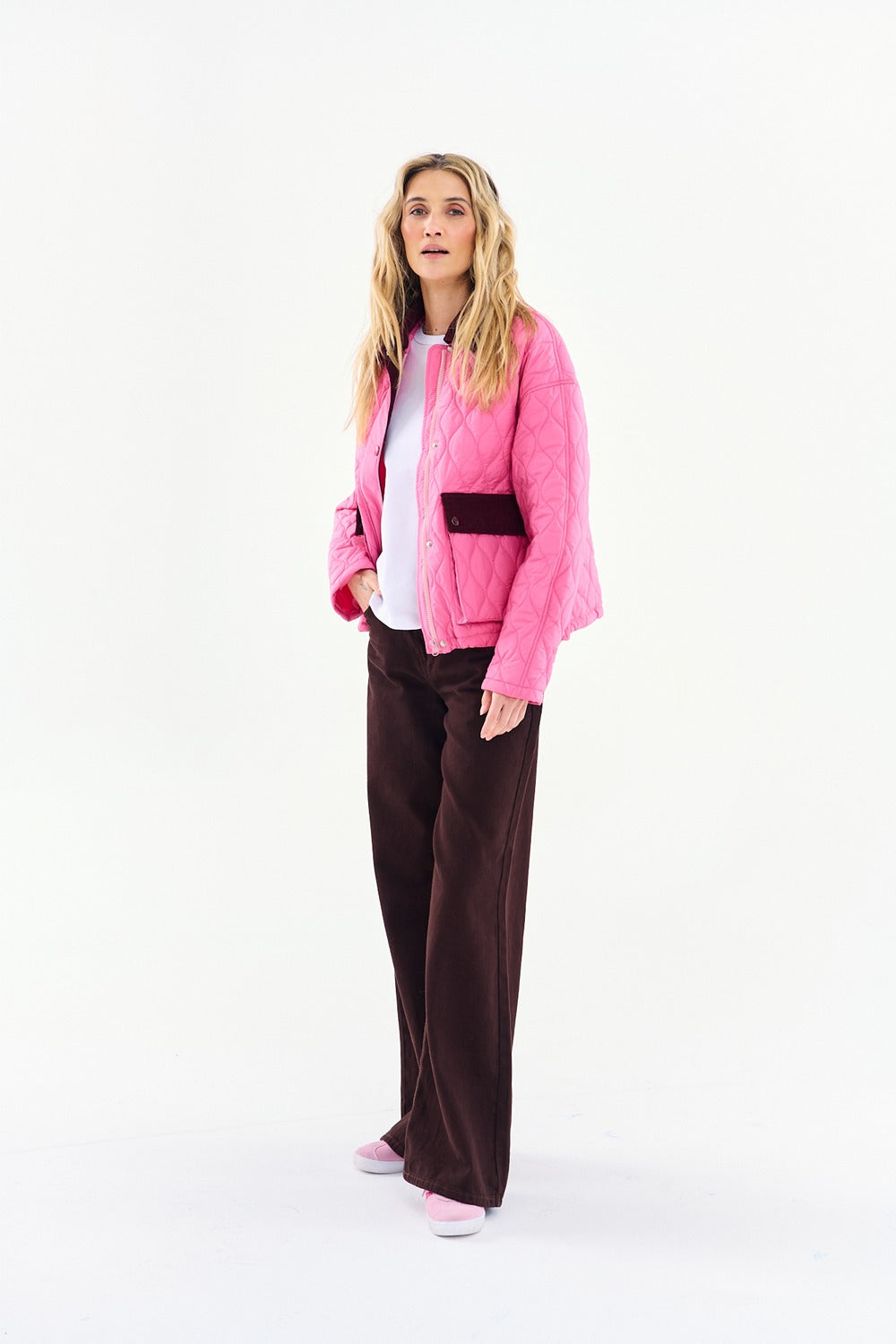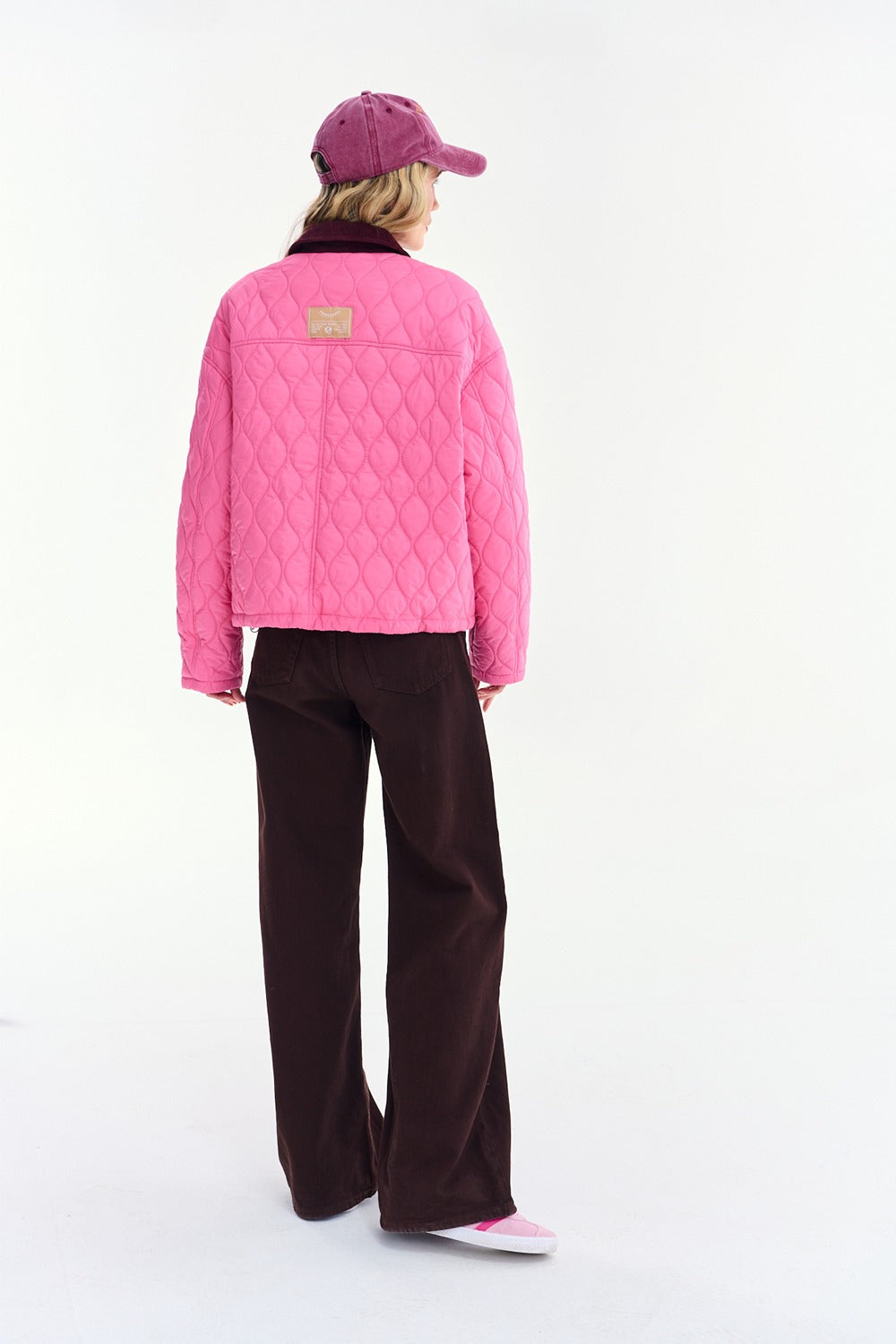 The Raspberry Jam quilted jacket combines the lightness of quilting with fashionable corduroy. Lush pink combined with a burgundy collar creates a harmonious yet expressive whole.