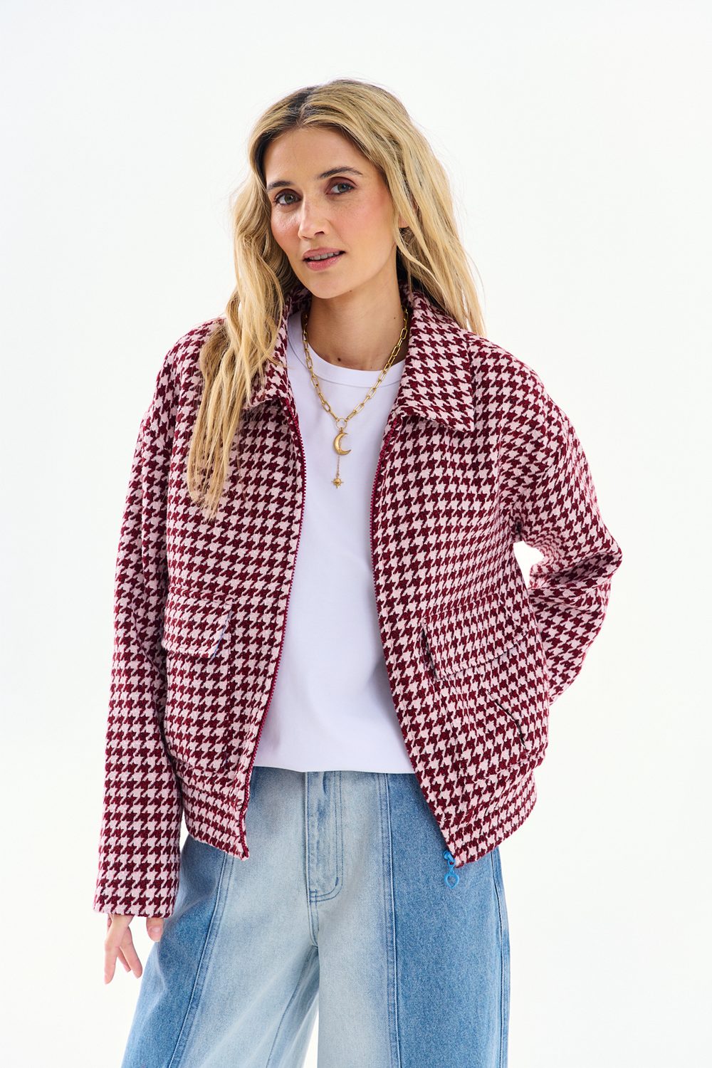 Wool Bomber Jacket with Houndstooth Pattern