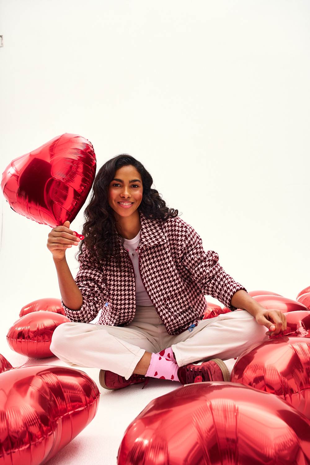 The Berry Spark Wool Jacket is a modern interpretation of a classic pattern. The brown and beige houndstooth pattern gives it a refined touch, while the short, ribbed design adds a sporty touch.