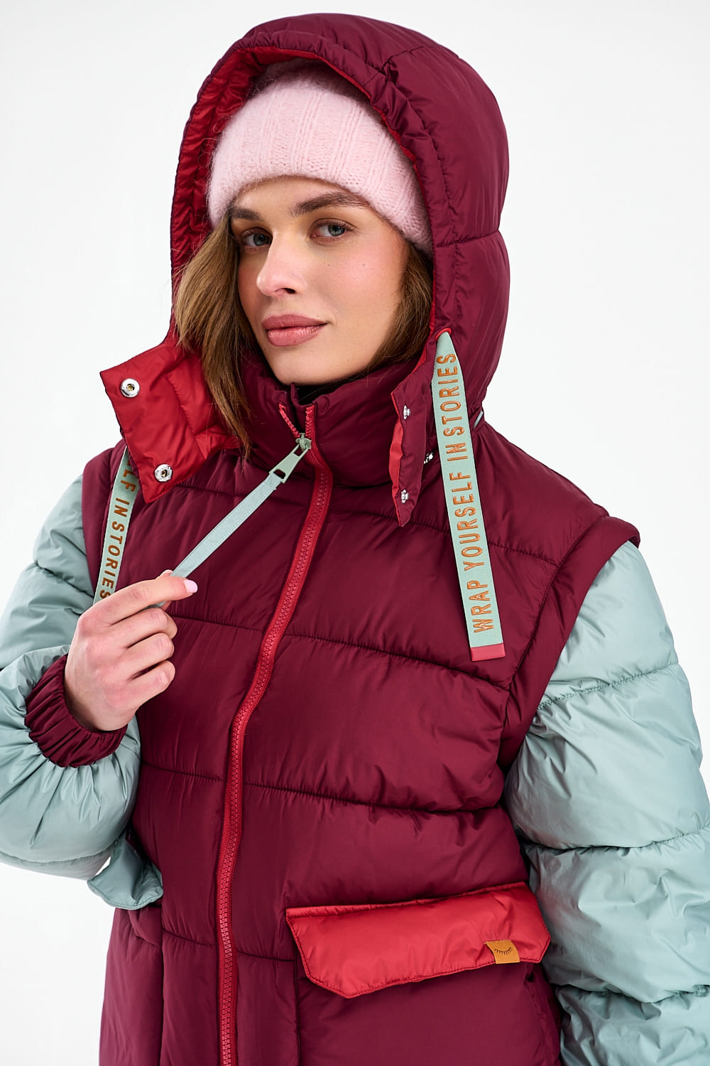 Vinterra winter jacket with detachable sleeves is a choice for women who appreciate unconventional and stylish color combinations. The deep, wine-like burgundy shade on the body perfectly complements the pastel, mint green sleeves and vibrant red accents on the hood and pockets.