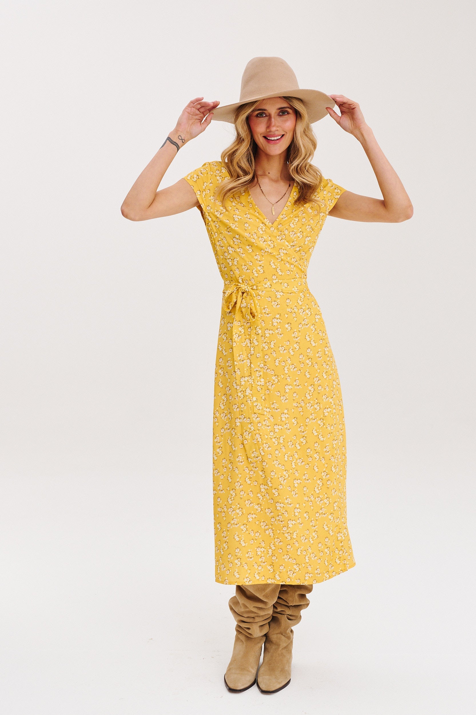 Lemon Loretta midi dress is the perfect choice for warm, sunny days. Its intense lemon color combined with a delicate floral pattern will make you stand out from the crowd with lightness and grace. The envelope cut with binding at the waist beautifully emphasizes the silhouette, and the short sleeve adds a girlish charm.