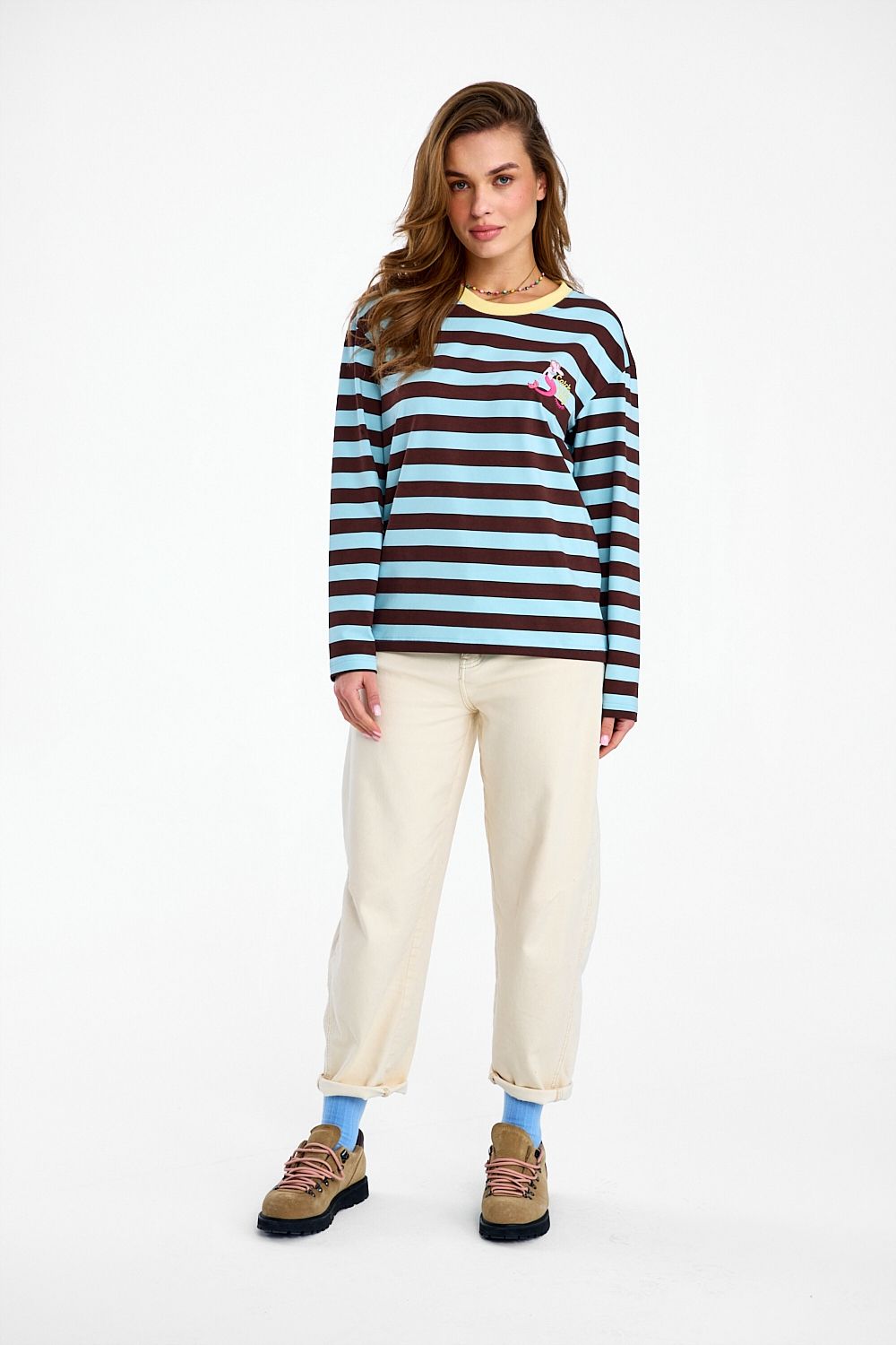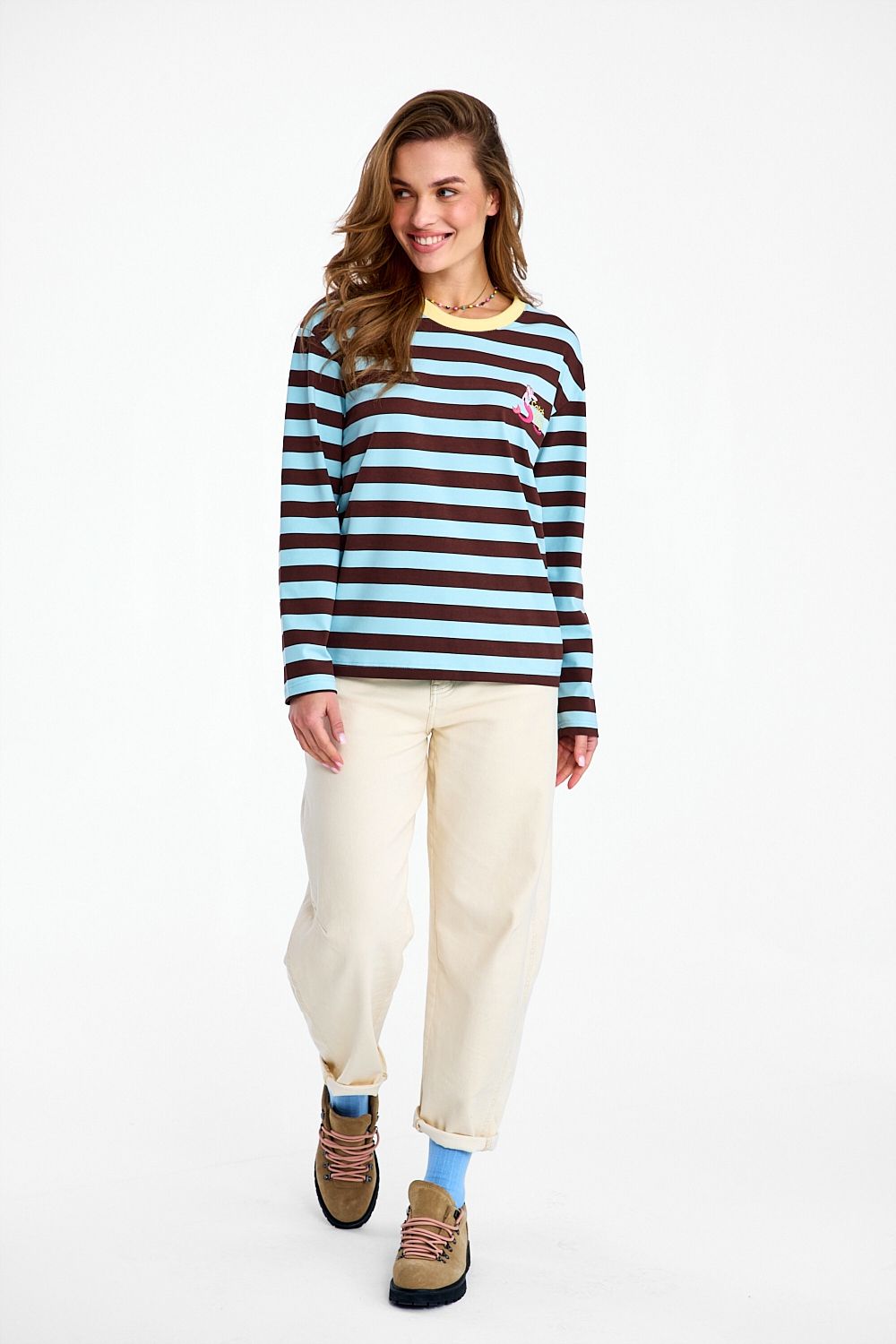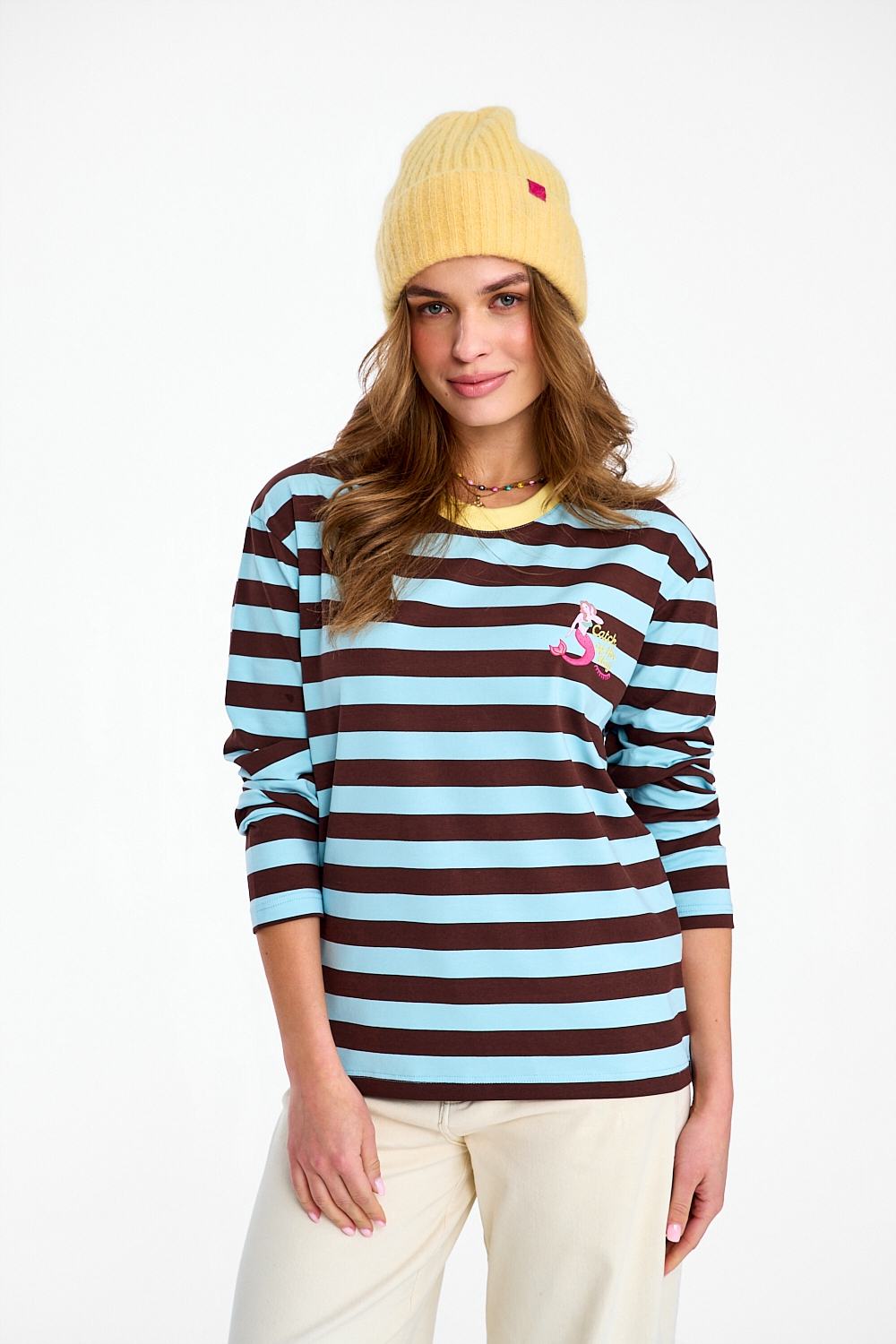 Catch of the Day Longsleeve is a piece that breaks the mold. The unusual color combination – fresh mint and warm brown – creates an interesting, geometric effect. The yellow ribbed neckline adds a retro vibe, and the "Catch of the Day" print is the icing on the cake.