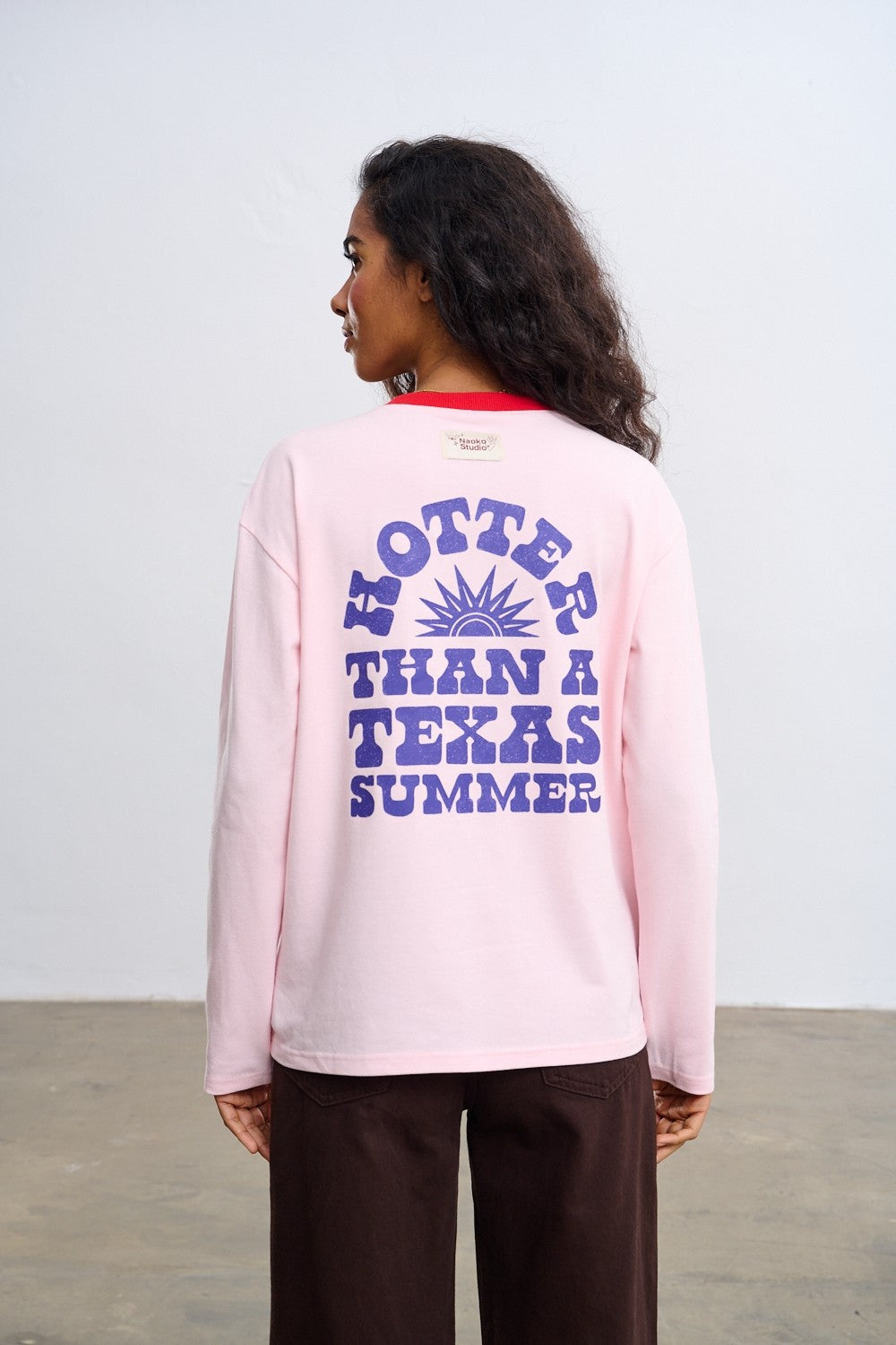 The Texas Sun Longsleeve is a dose of optimism straight from Jessica Molina. As part of the Naoko x Artist Remix project, the artist has transferred her love of vibrant colors and typography to clothing. A pastel pink base with a contrasting red neckline is the perfect backdrop for the energetic graphics.