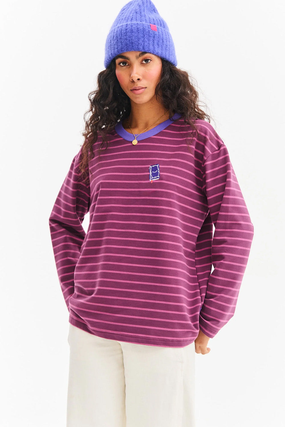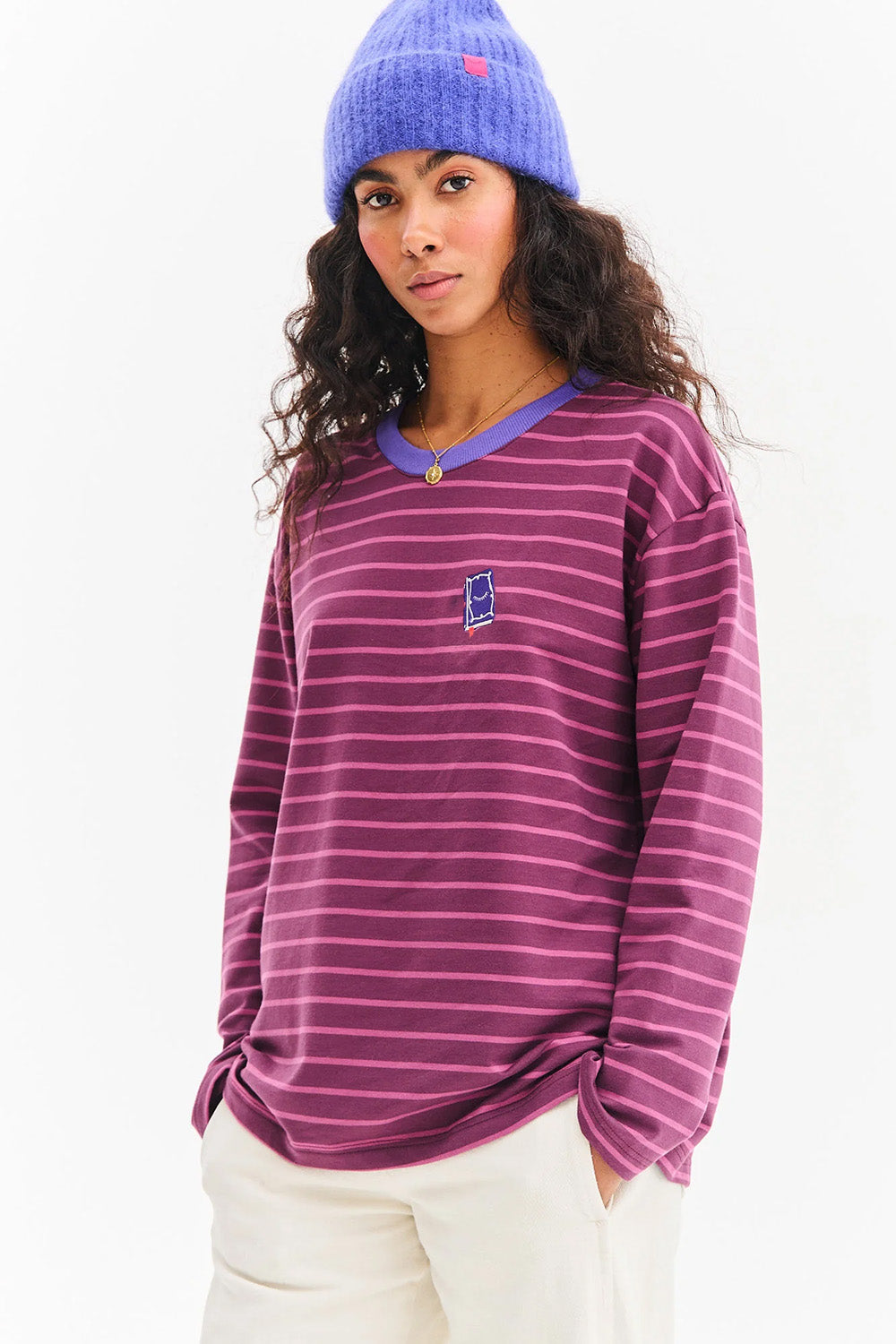Striped ribbed longsleeve is the essence of comfort and style. Its fitted cut perfectly emphasizes the silhouette, and the soft knit fabric with subtle stripes is extremely pleasant to the skin. A contrasting purple welt at the neck adds to its character.