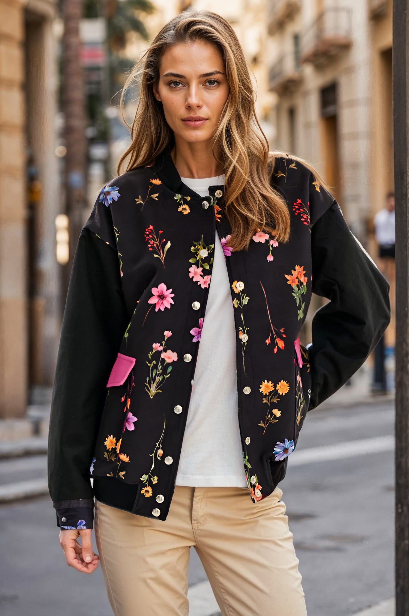The Magnolia Moon Bomber is a combination of a classic cut with a distinctive spring accent. The combination of black, classic color and delicate pattern means that all eyes will be on you with this bomber!