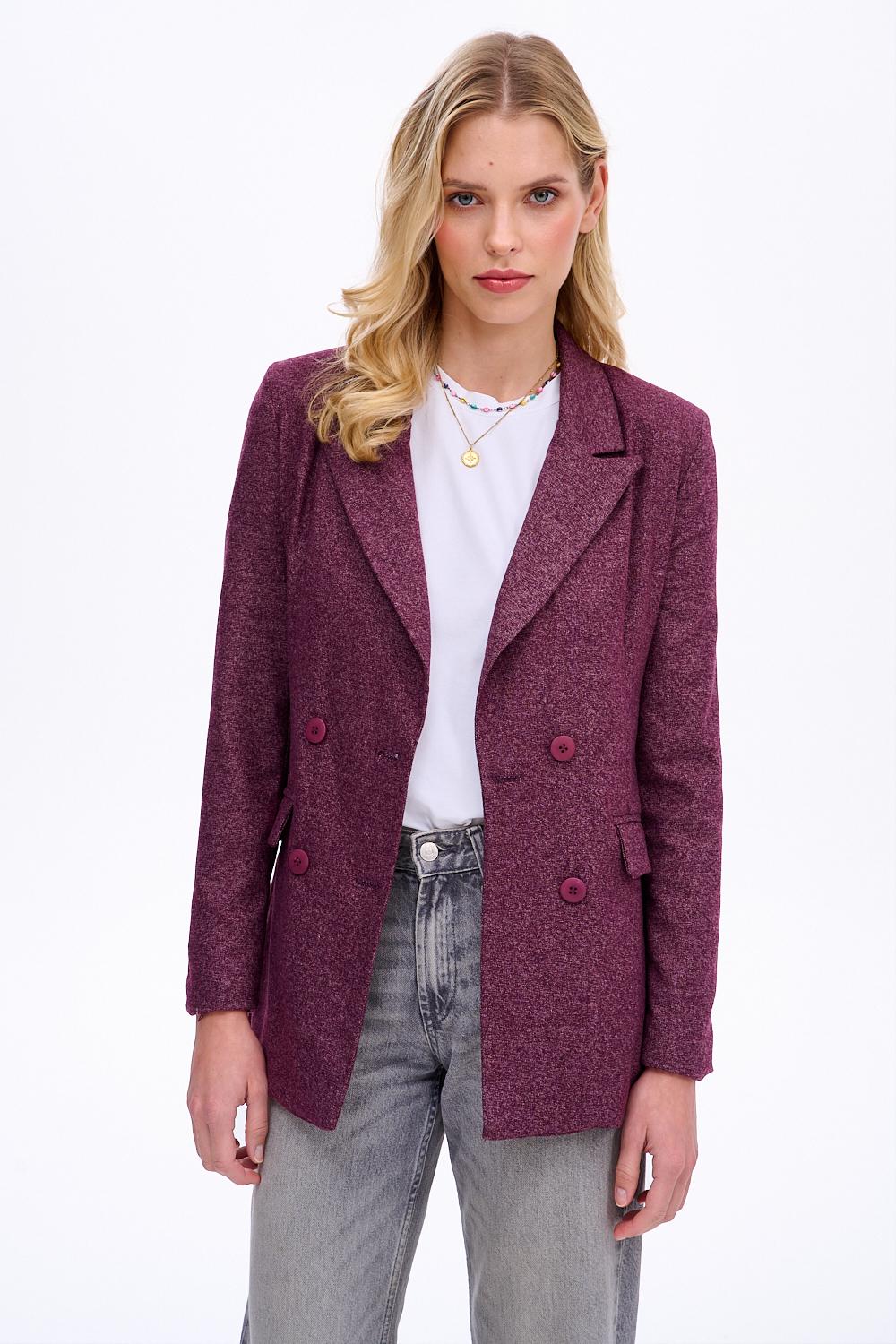 Ruby Intentions blazer is synonymous with chic style with a hint of nonchalance. Made from a high-quality, textured fabric, it delights with its deep burgundy color. Its classic design holds a secret – the interior is finished with a lining featuring an original, romantic pattern, which you can subtly reveal by rolling up the sleeves.