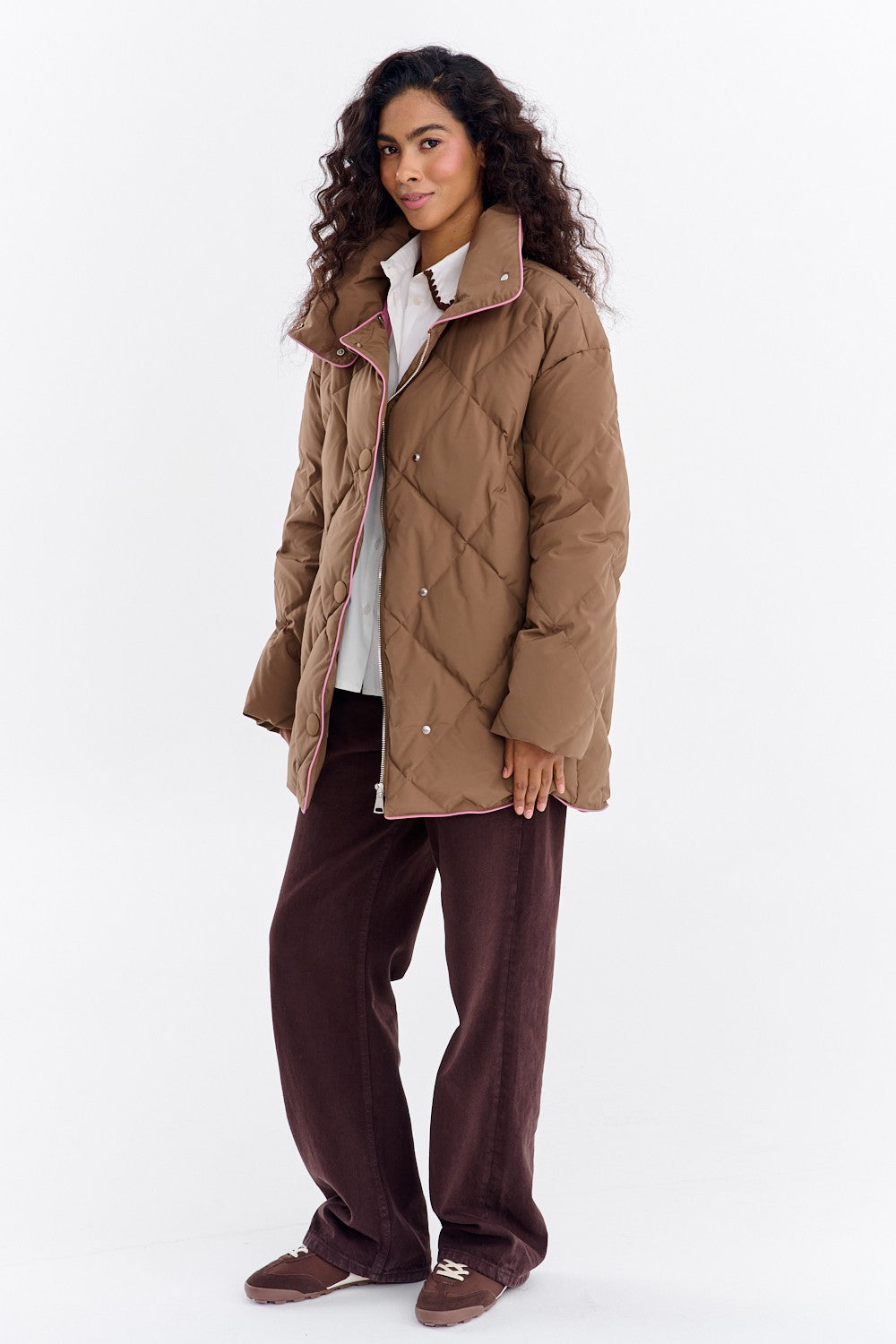 The Meribel Spicy Mocha Down Jacket is the essence of autumn and winter comfort. Designed for those who value warmth without sacrificing style. The deep, chocolate brown shade beautifully complements subtle pink accents at the buttons and hem.
