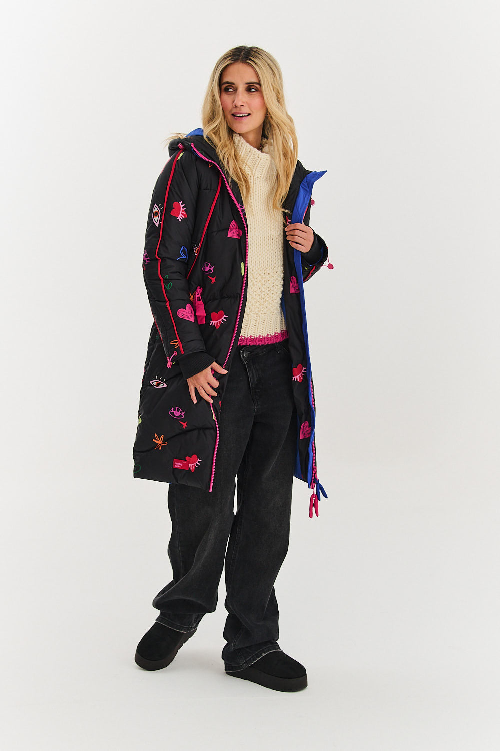 The black base of the coat is the perfect backdrop for energetic hearts, eyes and symbols. Loose fit with slightly batwing sleeves provides full freedom of movement. Warm filling, high collar and spacious hood with blue lining are a guarantee of comfort on the coldest days.