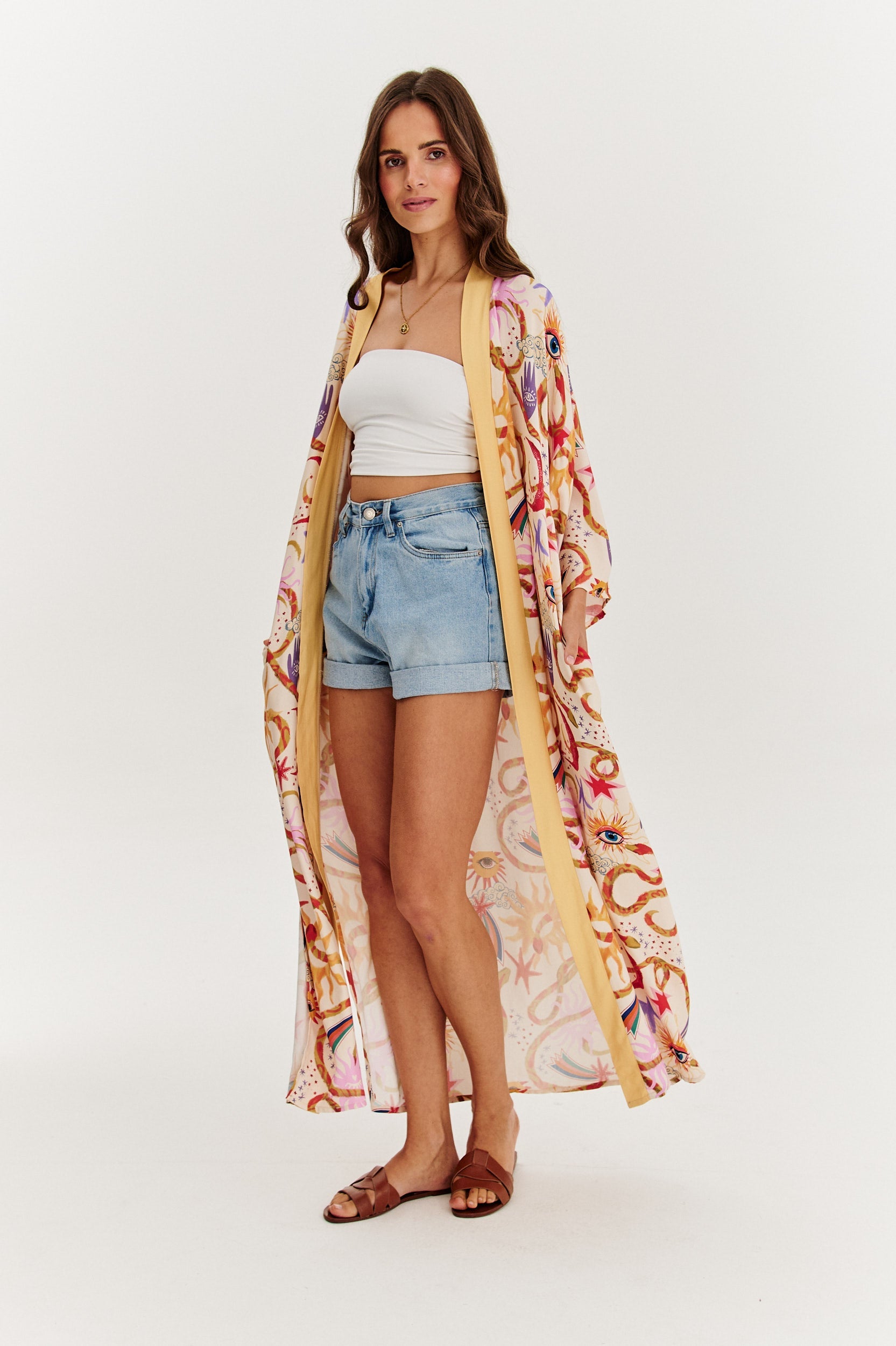 With its long cut, wide sleeves, and contrasting trim, Moon Whisper kimono can be worn in many ways – belted as a dress or open as a lightweight cover-up over a swimsuit or trousers. It's the perfect choice for women who embrace their individuality and love to add a little mystery to their summer looks.