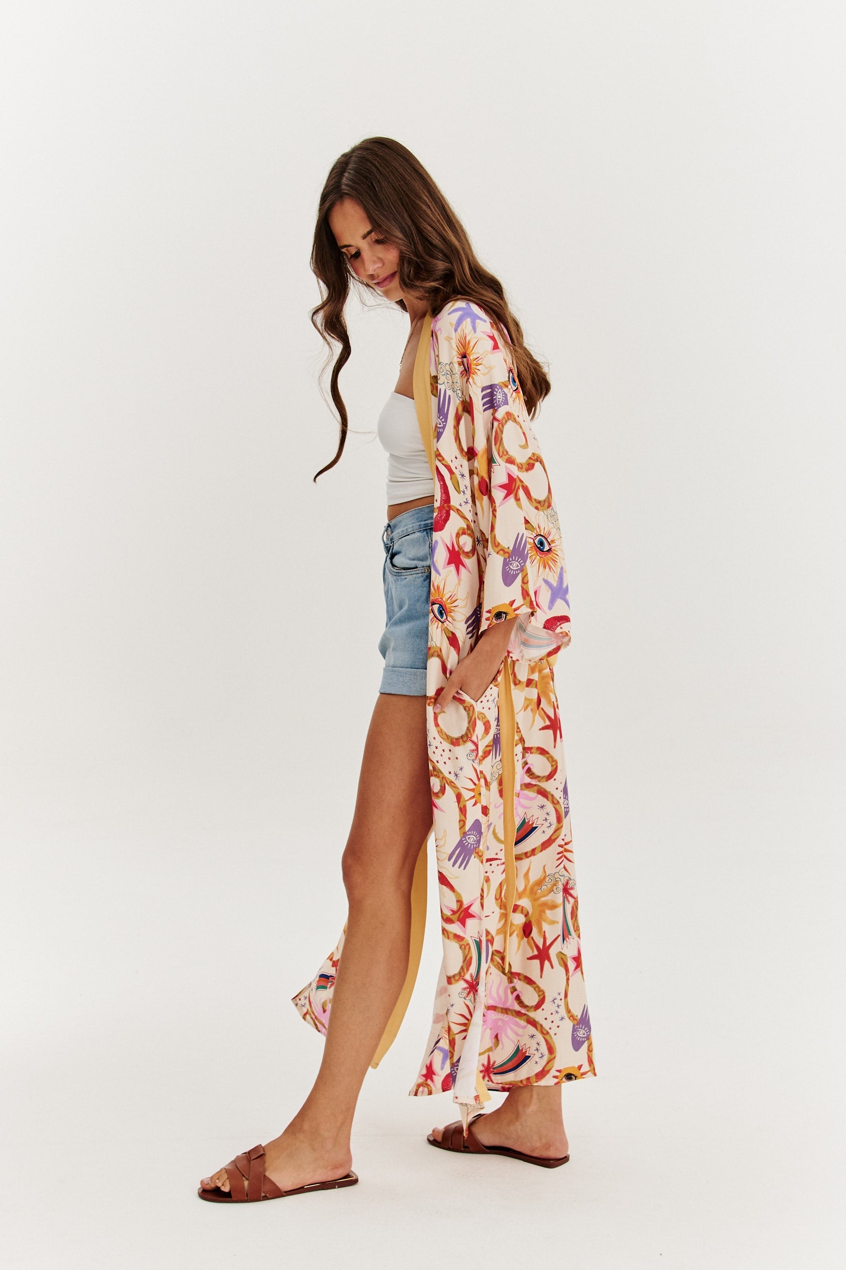 Moon Whisper kimono is a unique wrap inspired by mystical symbols and vibrant colors. Its all-over print in shades of beige, red, pink, and navy features moons, hands, suns, and snakes – all echoing the energy of celestial rituals and hidden meanings.