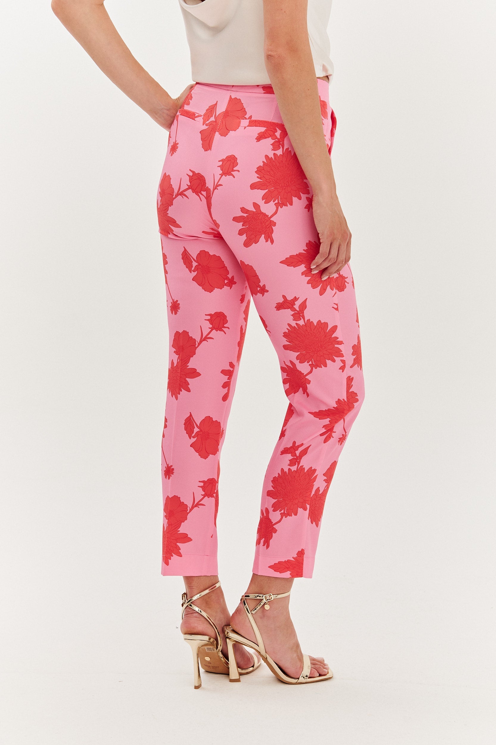 Model with a classic, slightly tapered cut of a cigarette type, with a high waist and pockets on the back. Made of lightweight, comfortable fabric, the pants are distinguished by a large floral pattern in contrasting colors - saturated red on an intense background of pink. This is a stylish proposition for bold women who like fashion experiments.