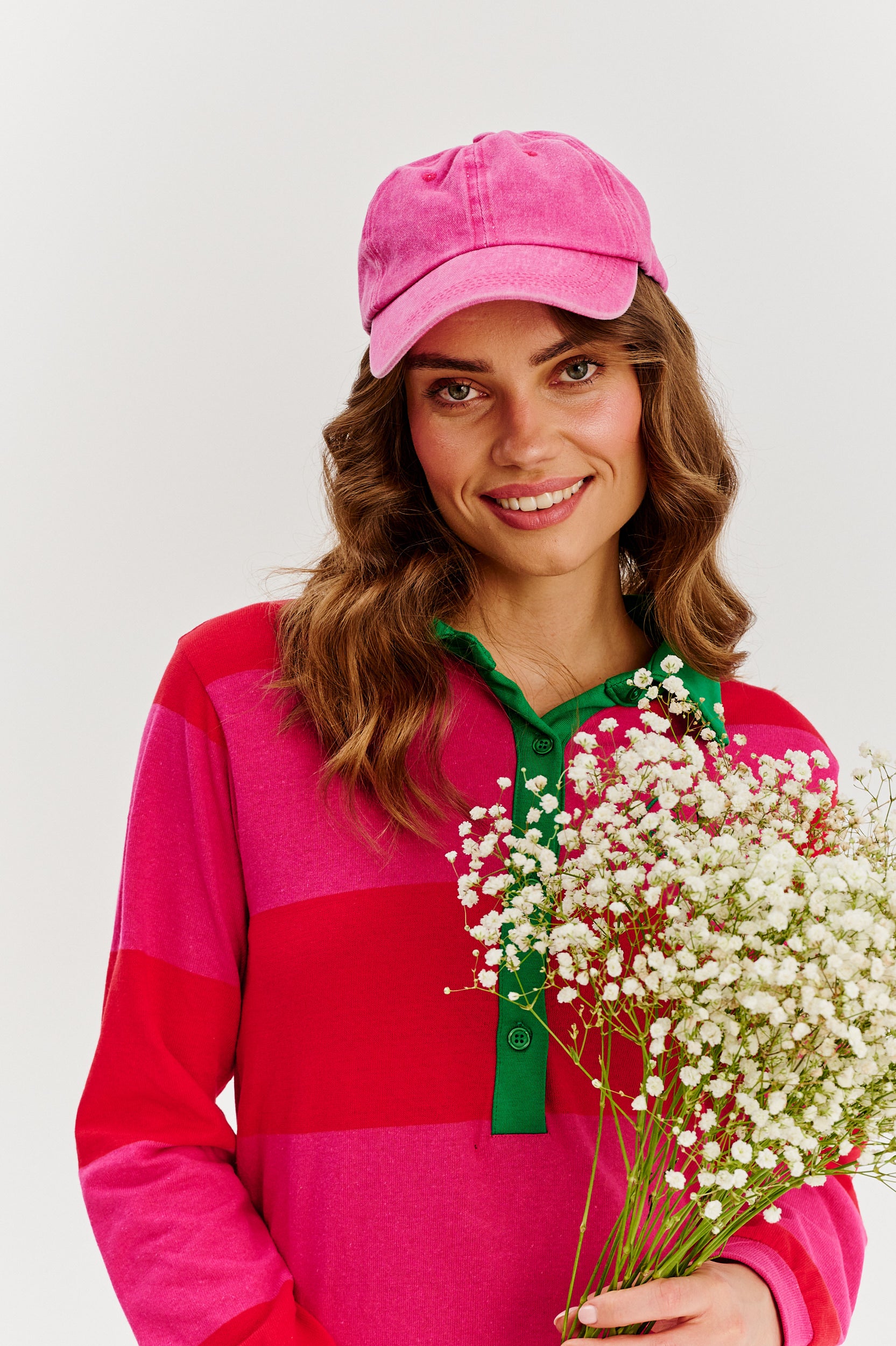 No Limits knitted polo dress is an option for women who like expressive colors and sporty casualness in a fashionable way. Intense stripes in shades of fuchsia and red add energy and stand out against classic cuts. The green polo collar gives it a unique character, creating an interesting contrast with the rest of the dress.