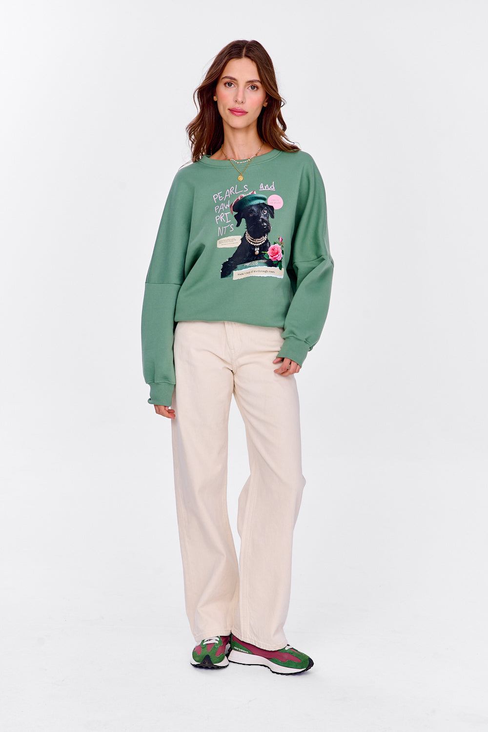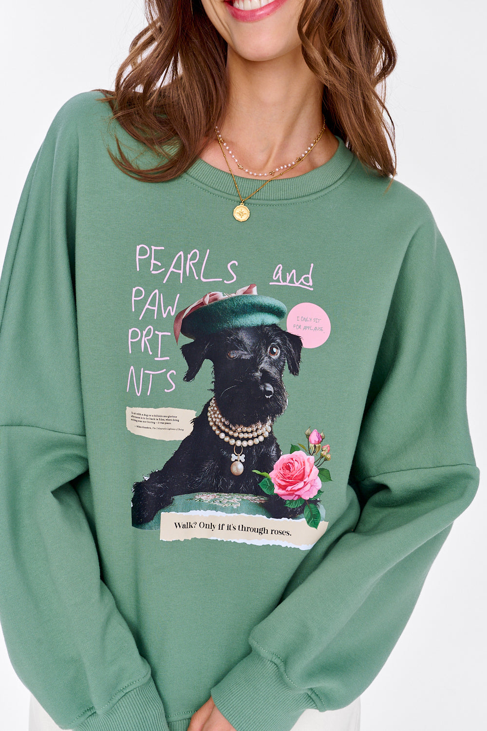Pearls Before Walkies sweatshirt is where dog attitude meets fashion flair. The oversized silhouette in olive green is eye-catching on its own, but it's the print – a stylish dog in a beret and pearls, holding a rose – that truly steals the spotlight.