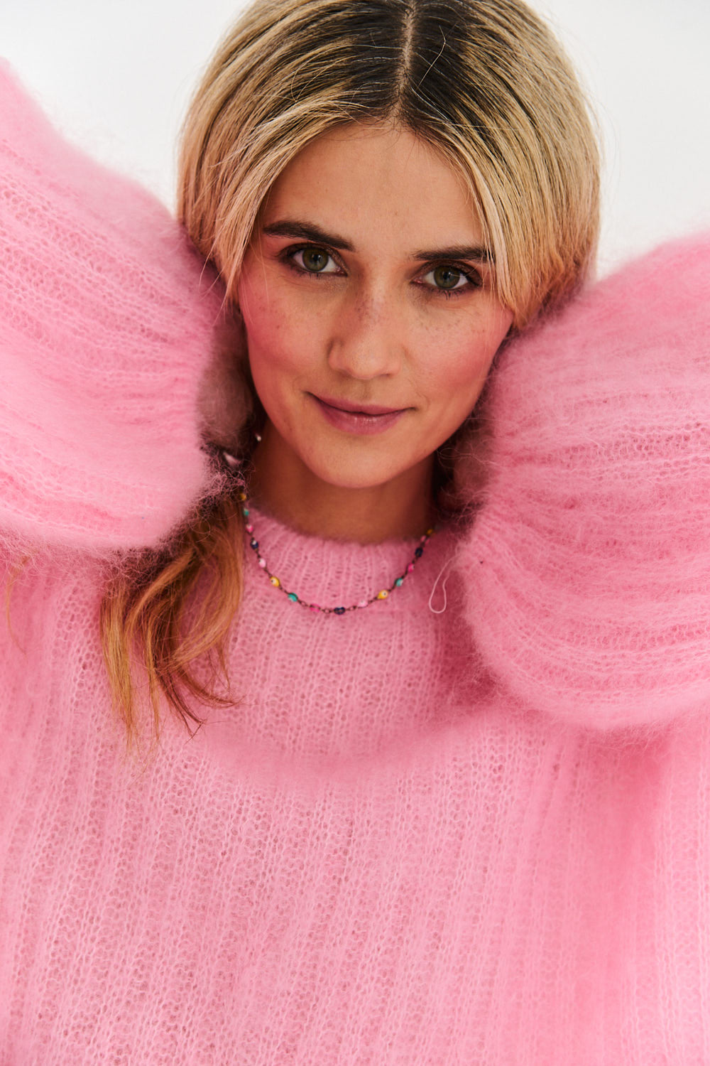 Peony mohair sweater is a real gem in the collection. It combines the luxurious softness of mohair with an extremely fashionable cut. The main role is played by spectacular wide balloon sleeves, which add lightness to the silhouette.