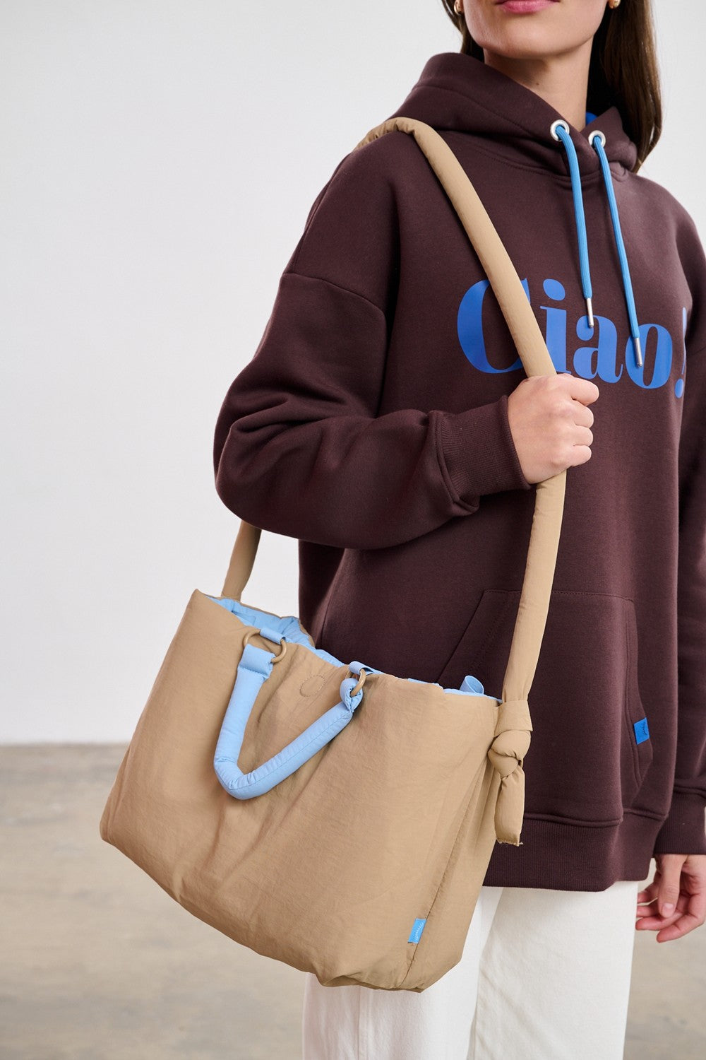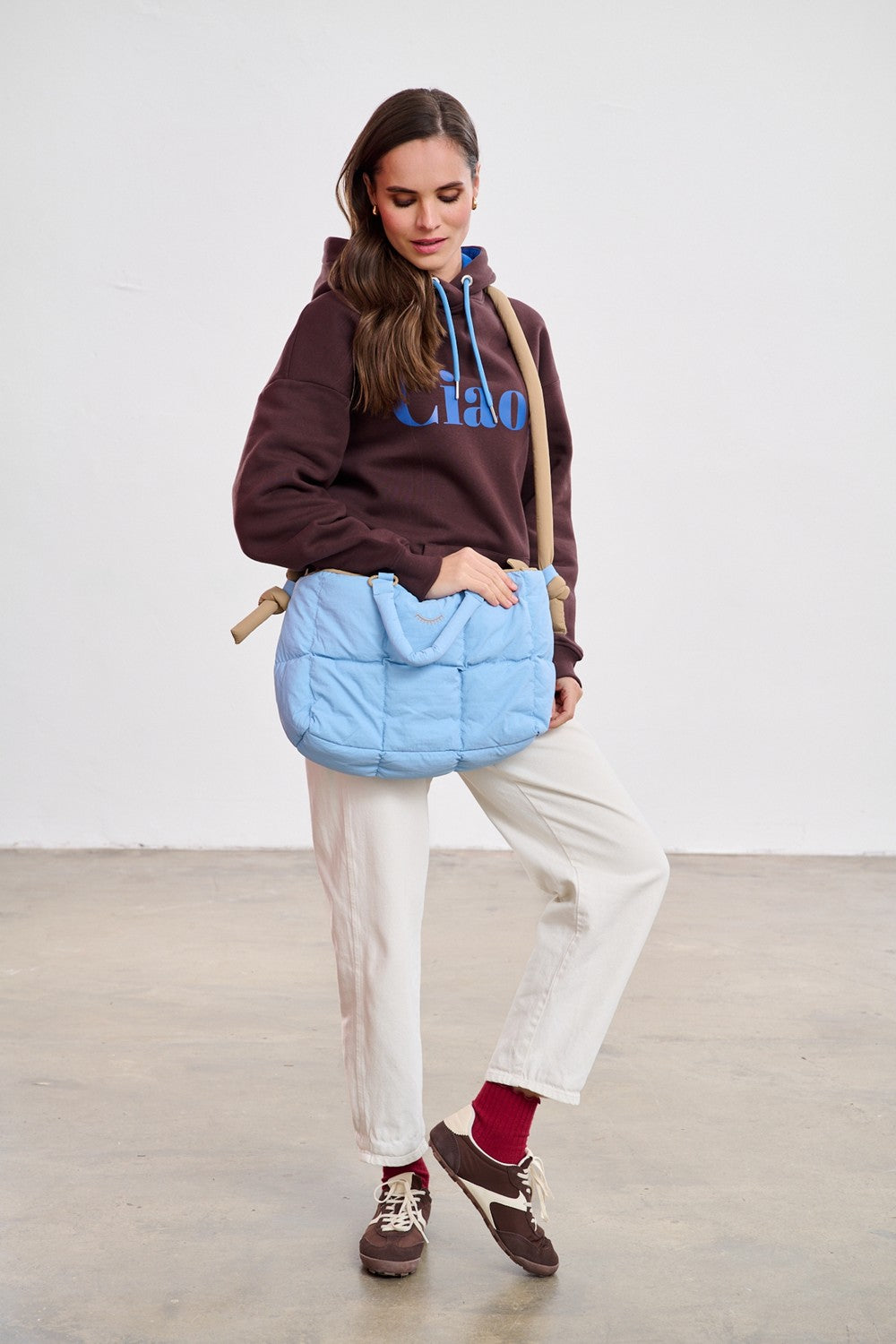 Sky Match bag is a master of adaptability. This reversible, quilted "shopper" model will let you change your style in a second. Feeling like peace and quiet? Choose the sky blue side. Need a classic? Flip it over to elegant brown.