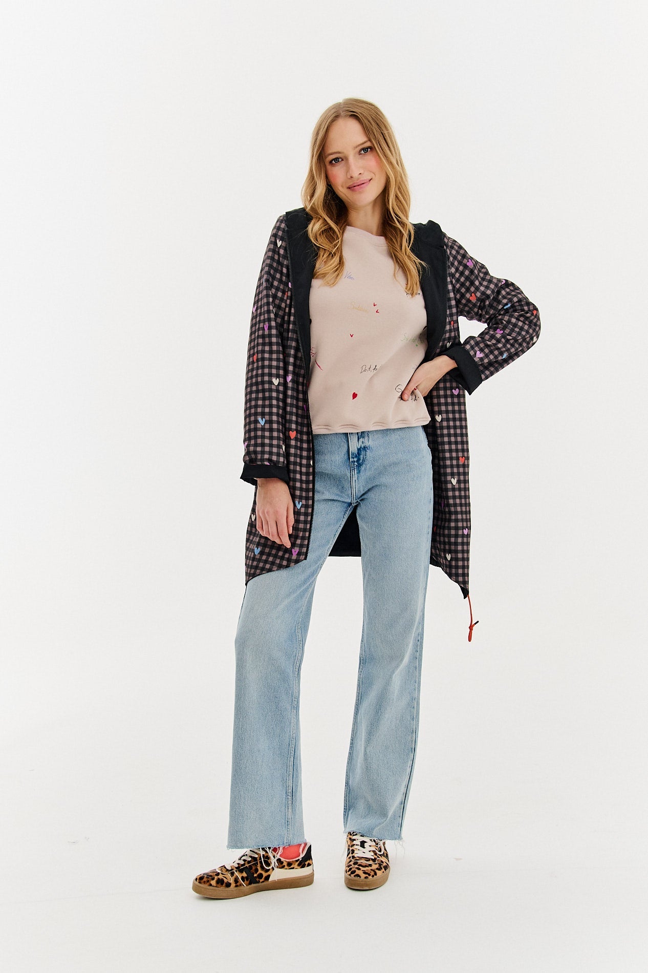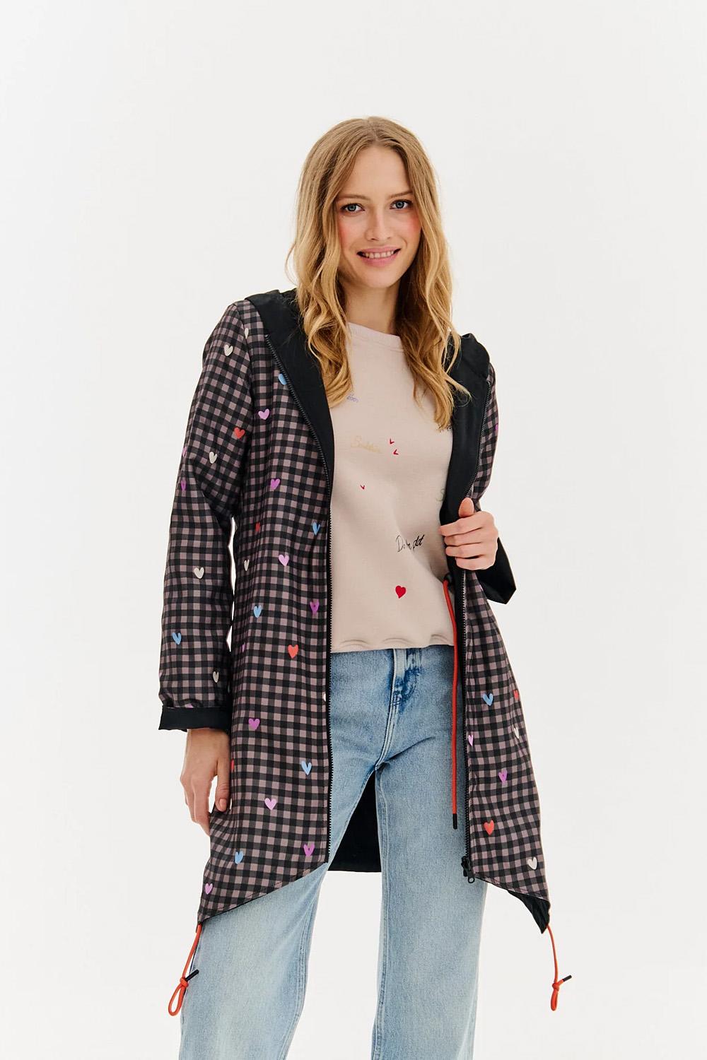 Pixel Love reversible parka is a coat that impresses with its originality and allows you to play with fashion every day. On one side, it catches the eye with an energetic checkered print broken up by colorful hearts, and on the other side, it captivates with a calm, timeless finish with an inspiring inscription on the back. It is a proposition for people who love to change their style and focus on unusual solutions.