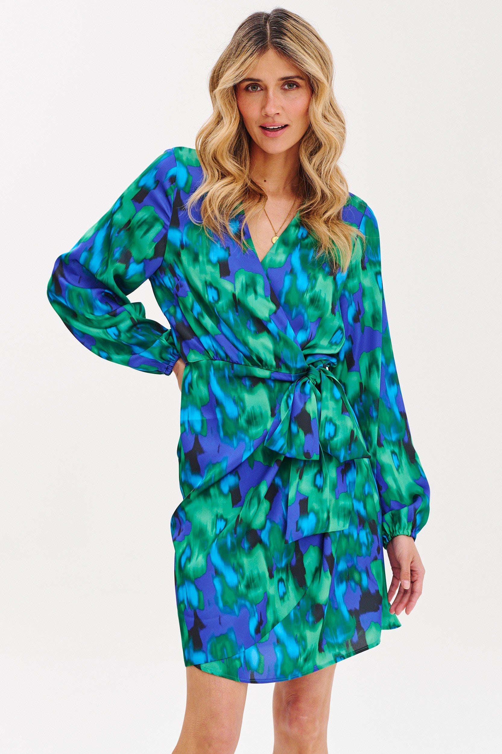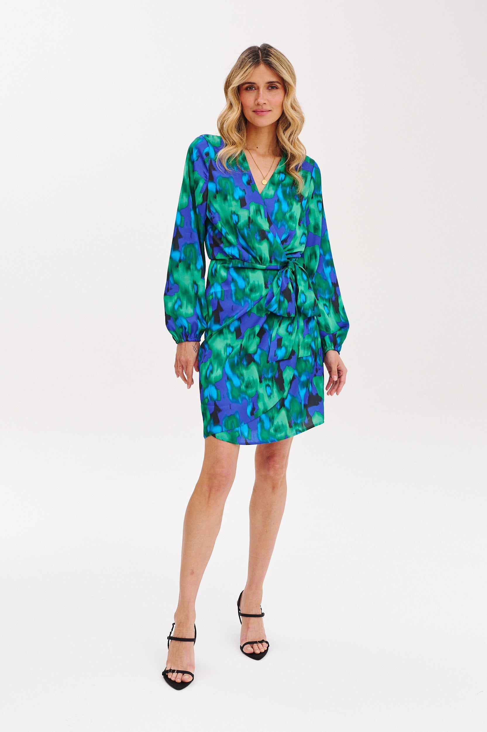 The envelope cut and short cut beautifully emphasize the silhouette, and the soft viscose fits pleasantly on the body. The print in shades of green and navy blue catches the eye and fits many occasions - from a summer outing with friends to an evening meeting. Long sleeves with a slight buffet add to its nonchalant casualness.