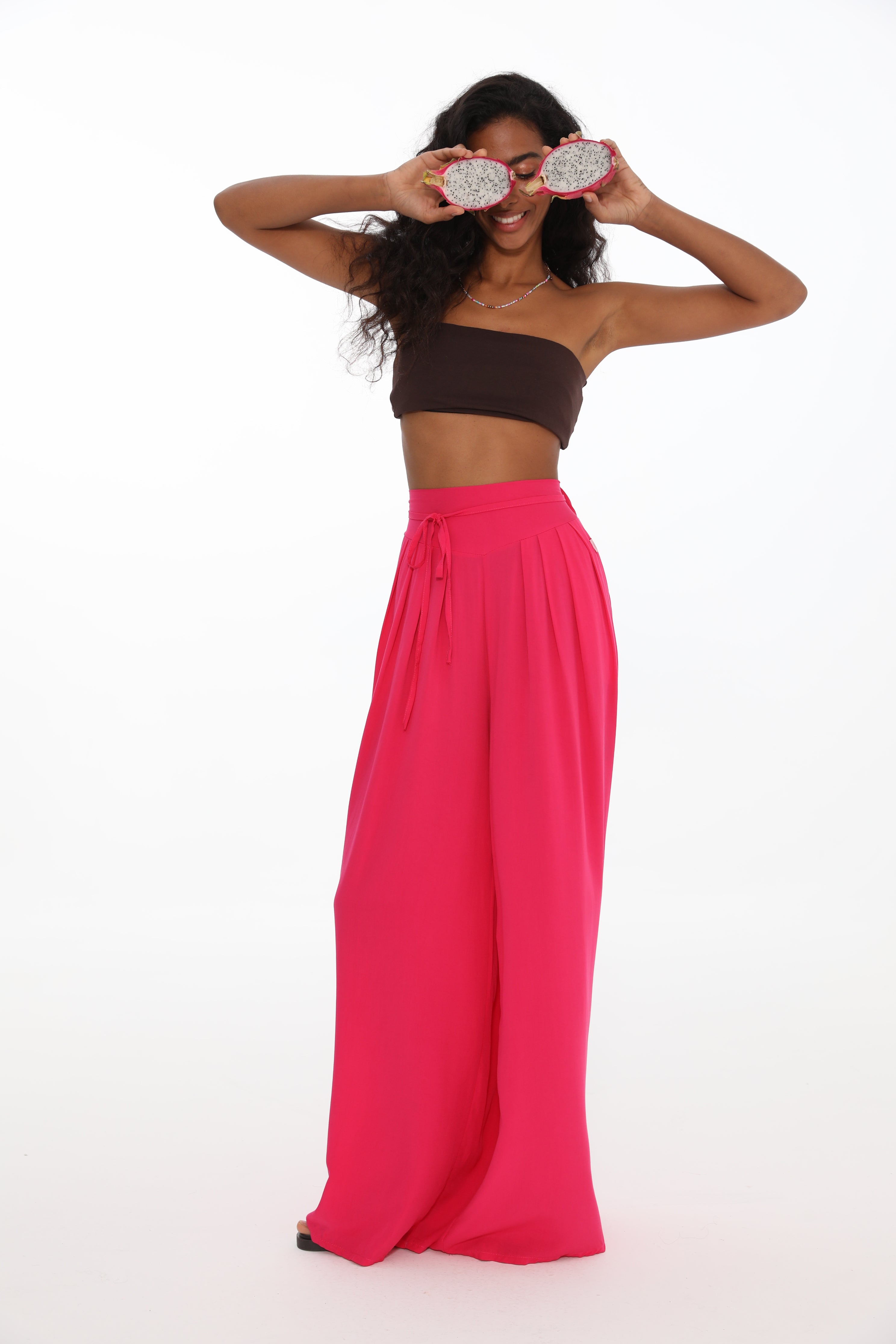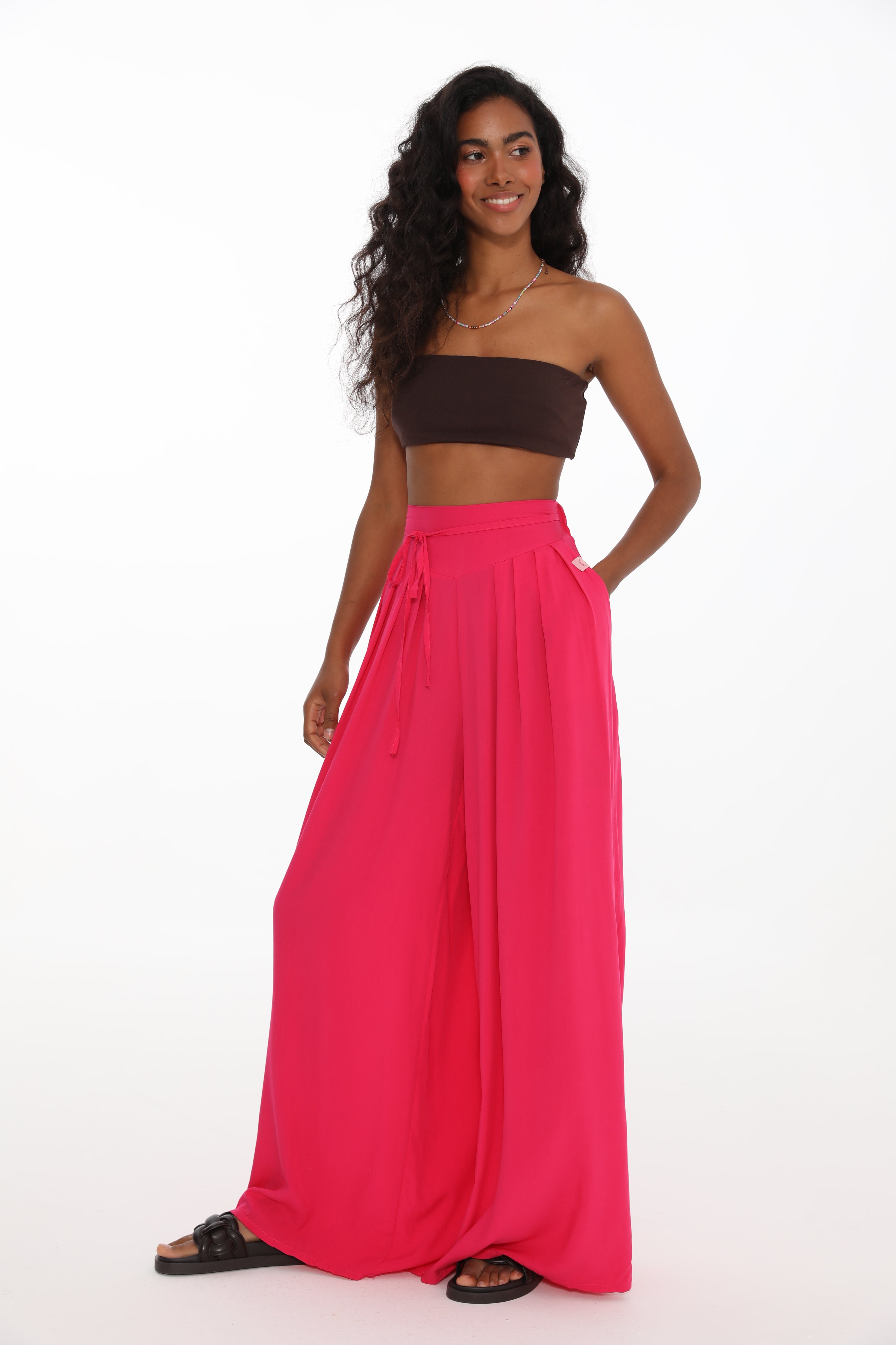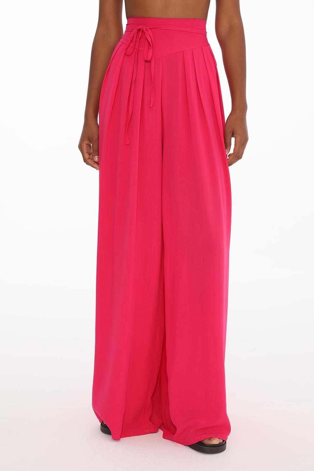 Raspberry Rave wide pants are an option for those who love color, looseness and comfort. Made of viscose, pleasant to the touch, they delight with energetic color and light, airy cut. The pants have a tie.