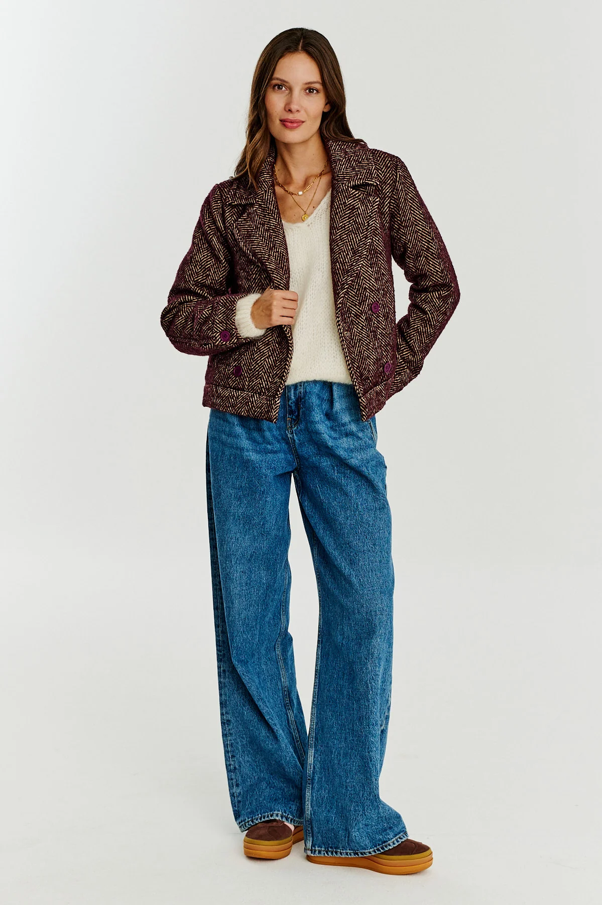 Retro Rouge ramones jacket with herringbone pattern, which gives it an elegant and classic look, is an ideal choice for a transitional jacket. It is a double-breasted model, which emphasizes its retro character, while the wide lapels add a modern nonchalance.