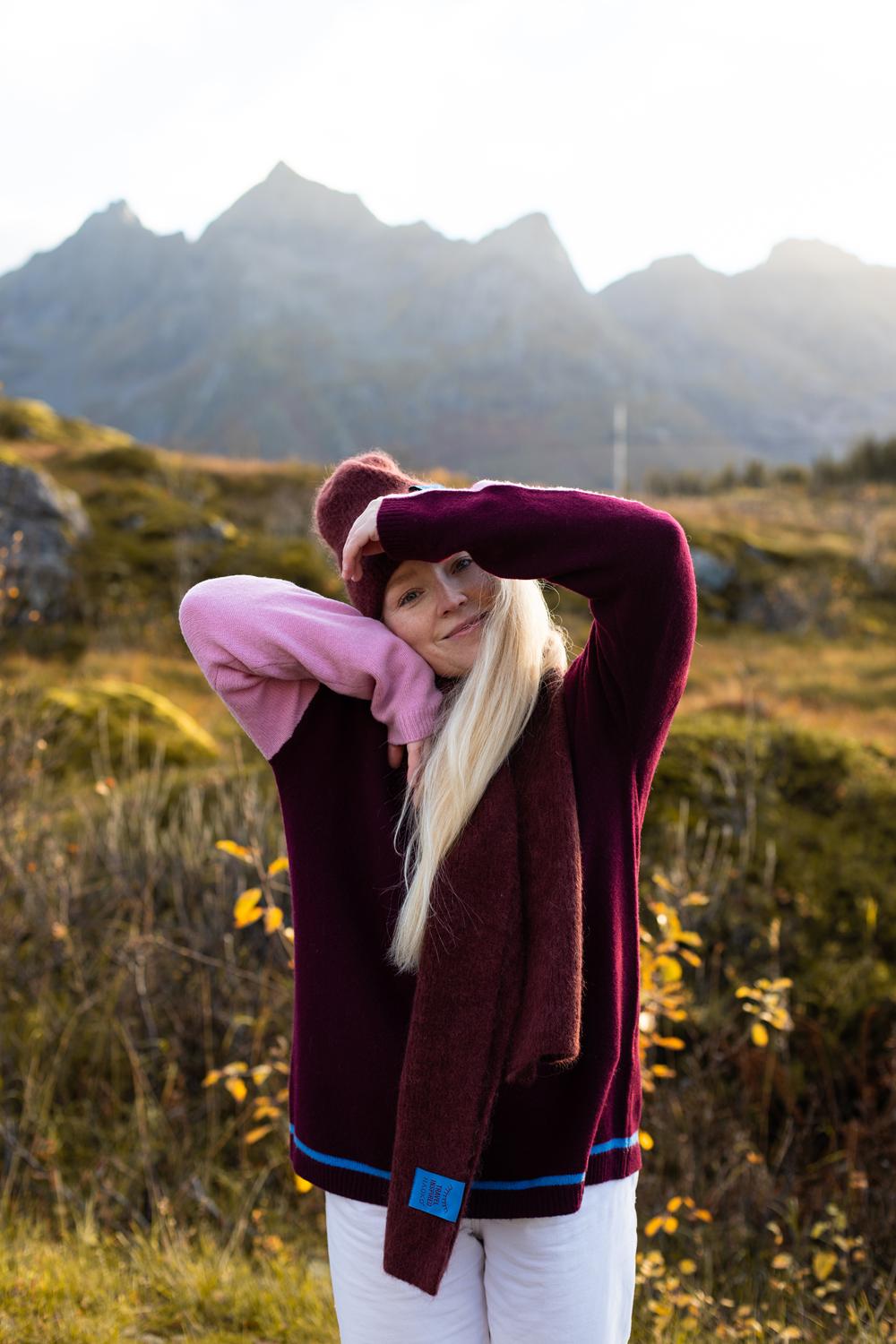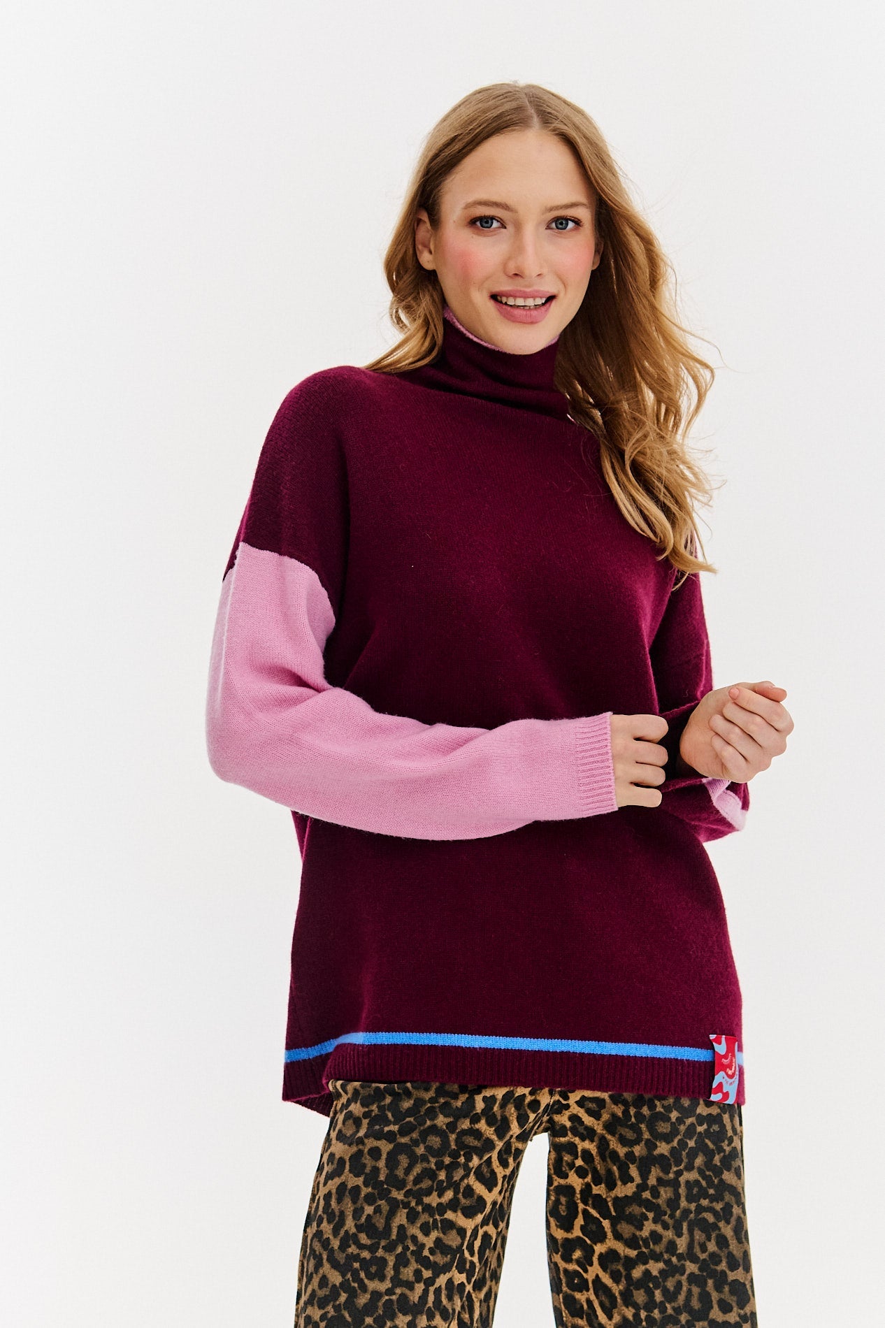 Thanks to the combination of deep burgundy with Rose Whisper pink inserts, it is perfect for both casual and more elegant outfits. Wear it with wide-leg pants or your favorite skirt to emphasize your unique style. Perfect for work, a walk, or a weekend getaway, this model will become your favorite fall and winter sweater.