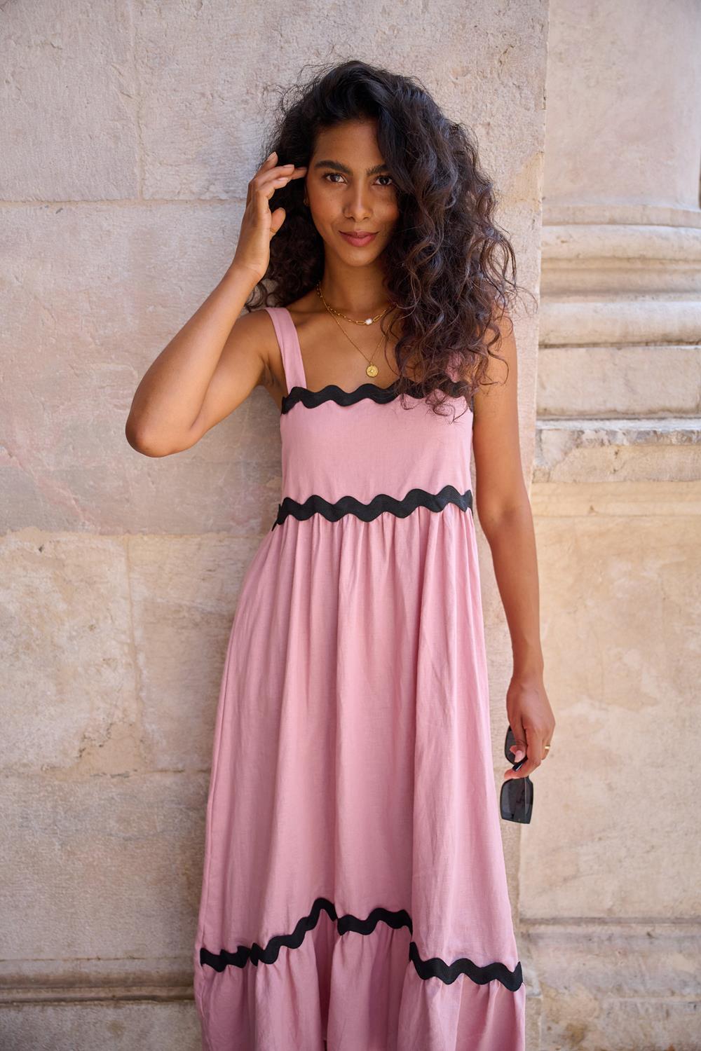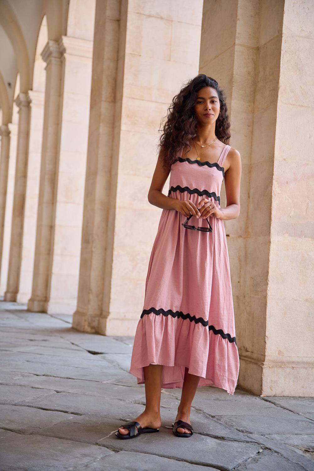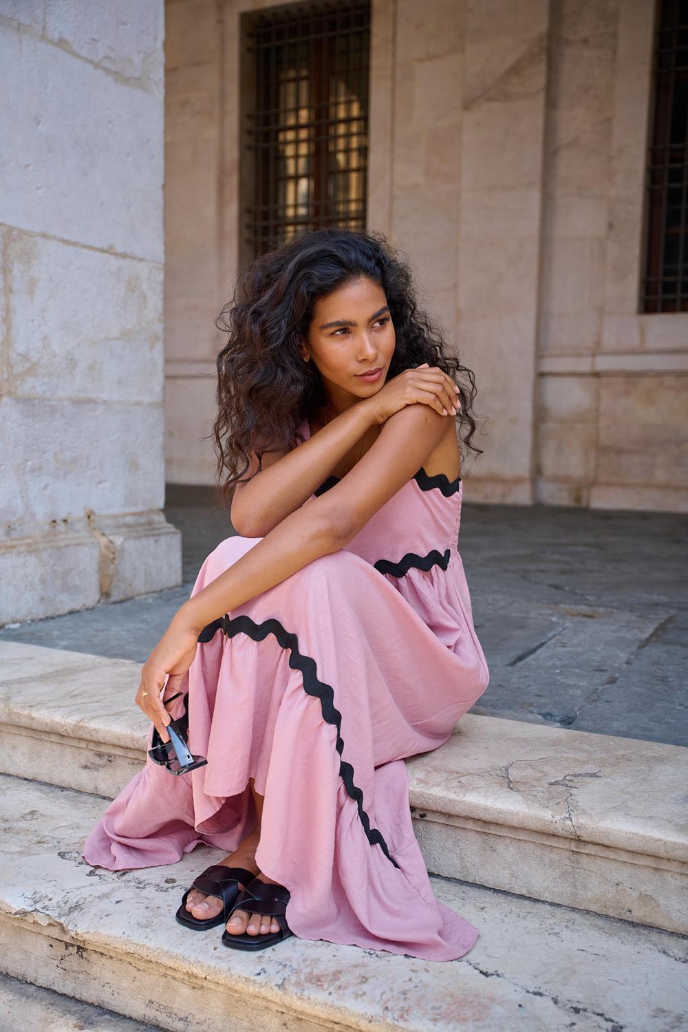 Rosewater Kiss midi dress with wide straps is made of a blend of linen and viscose which makes it extremely airy and lightweight, perfect for even the warmest days. The top of the dress is decorated with a ruffle with a black zigzag accent, which adds to its charm and originality. A similar decoration is on the lower trim of the ruffle, which harmoniously unites the whole. The upper part of the back is made of elastic material, which adapts to the figure, providing comfort and emphasizing the waist. The creases create an aesthetic effect and add charm to the dress.