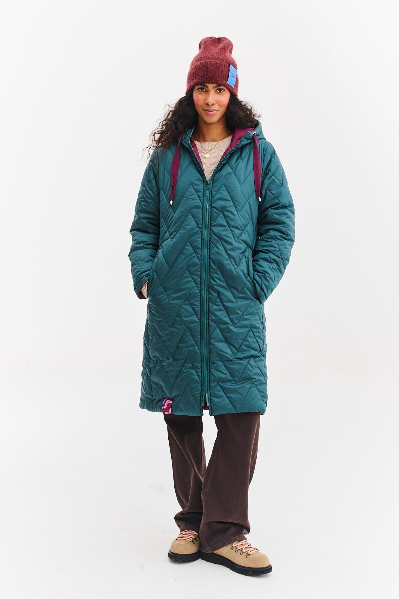 Sageberry double-sided quilted coat is the quintessence of functionality and style. Designed with changing moods and needs in mind, it allows for instant styling metamorphosis. On one side - elegant forest green, on the other - intriguing berry purple. Both sides are connected by a hood and high-quality quilting.