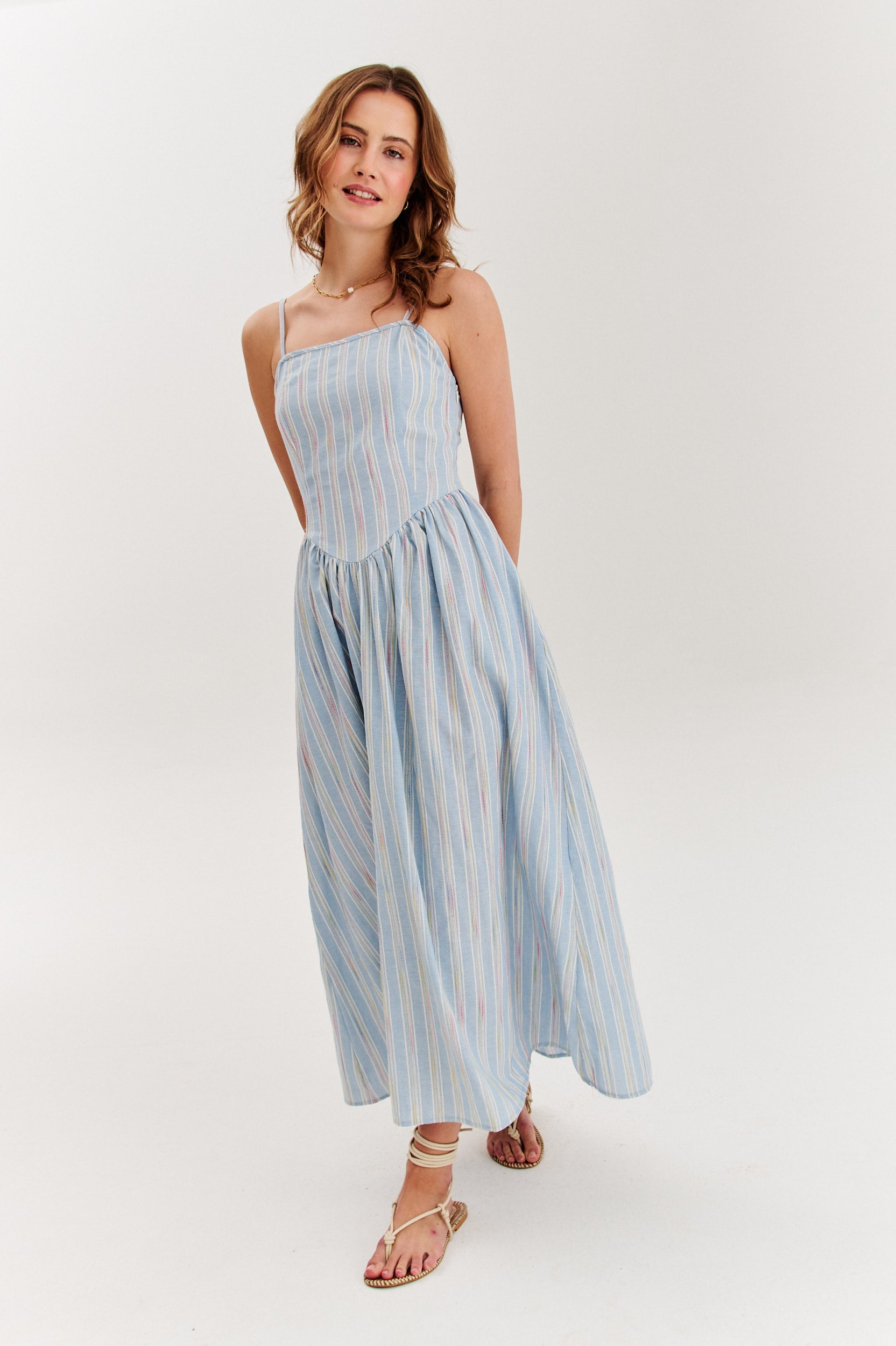 Salt Horizon midi dress is the essence of summer ease and freshness. Designed in subtle shades of blue with delicate stripes, it charms with its simple form and feminine cut. Adjustable straps and a slightly flared skirt make it the perfect choice for warm, sunny days.