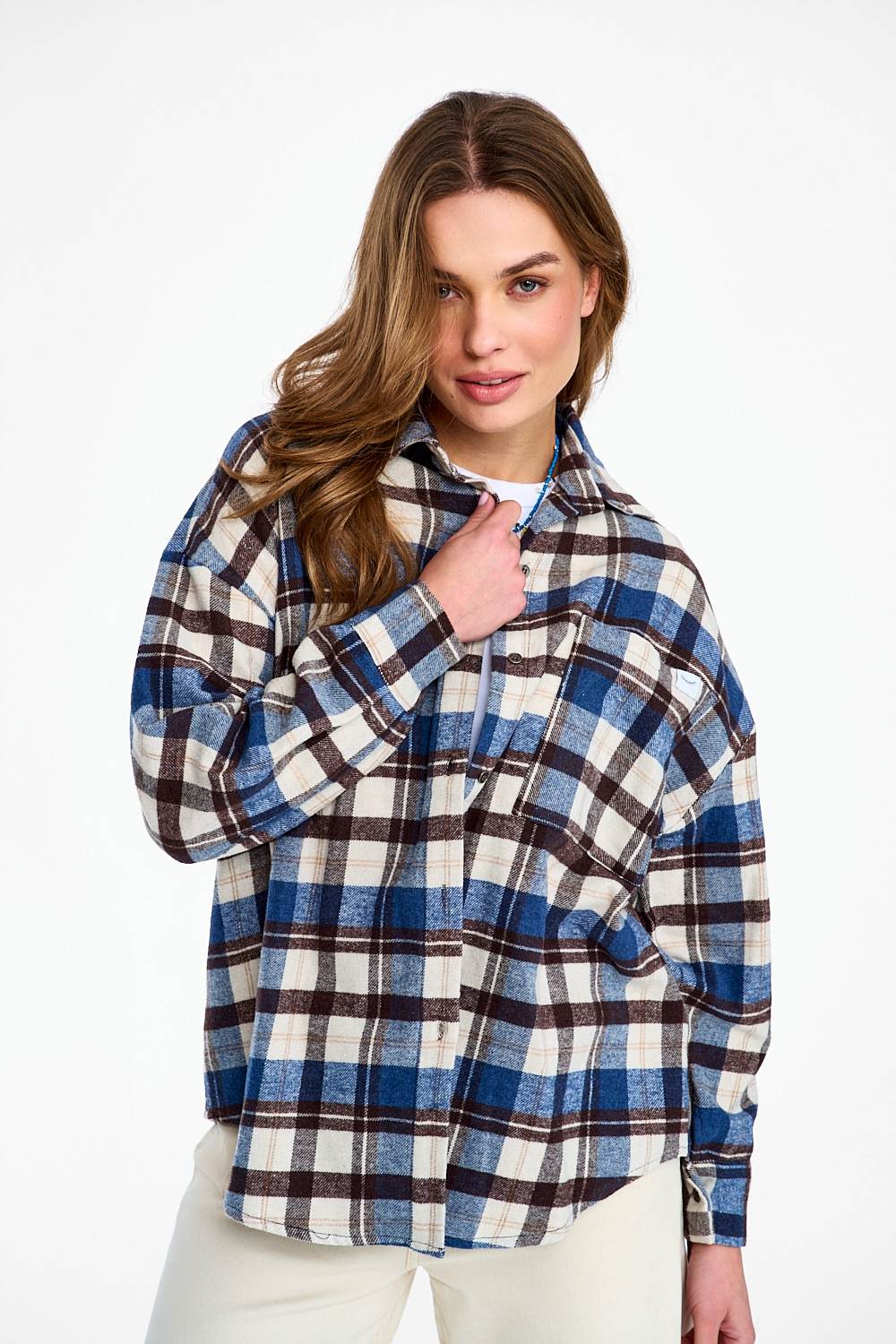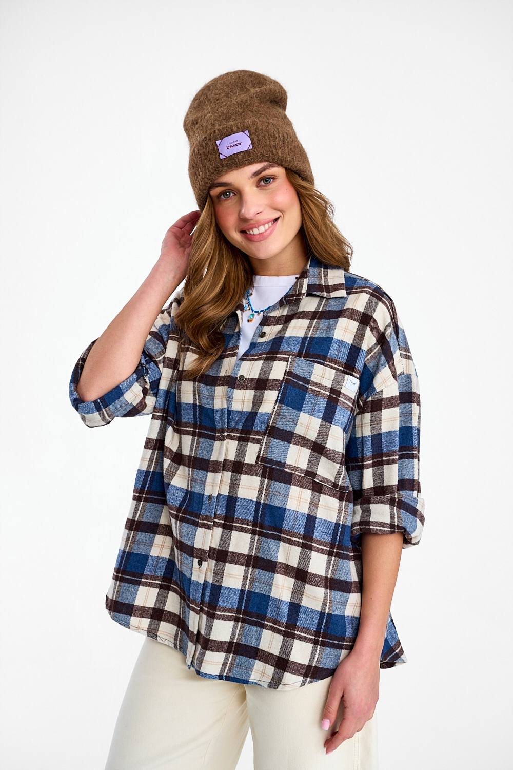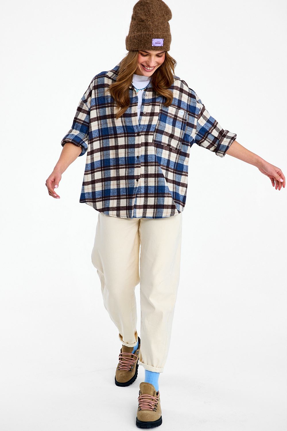 The Seattle Chic flannel shirt is a modern take on a classic. The timeless navy, white and brown check pattern makes this shirt extremely versatile. The loose oversized fit and soft fabric guarantee freedom of movement.