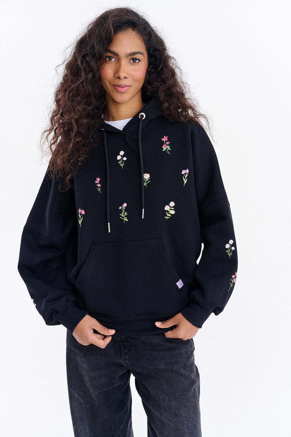 Small, wildflowers embroidered on the sleeves and front of the sweatshirt give it a unique, romantic character. The sweatshirt also has a practical kangaroo pocket. Wear it with leggings, your favorite jeans, or throw it over a sporty dress.
