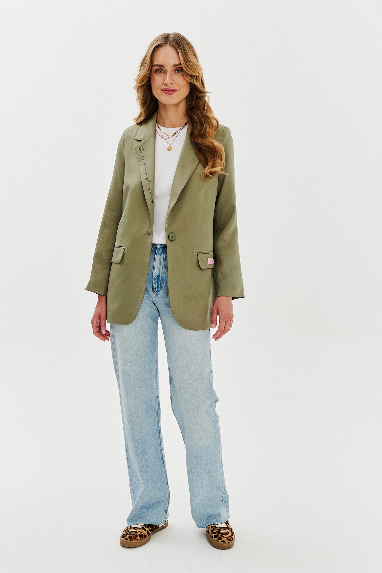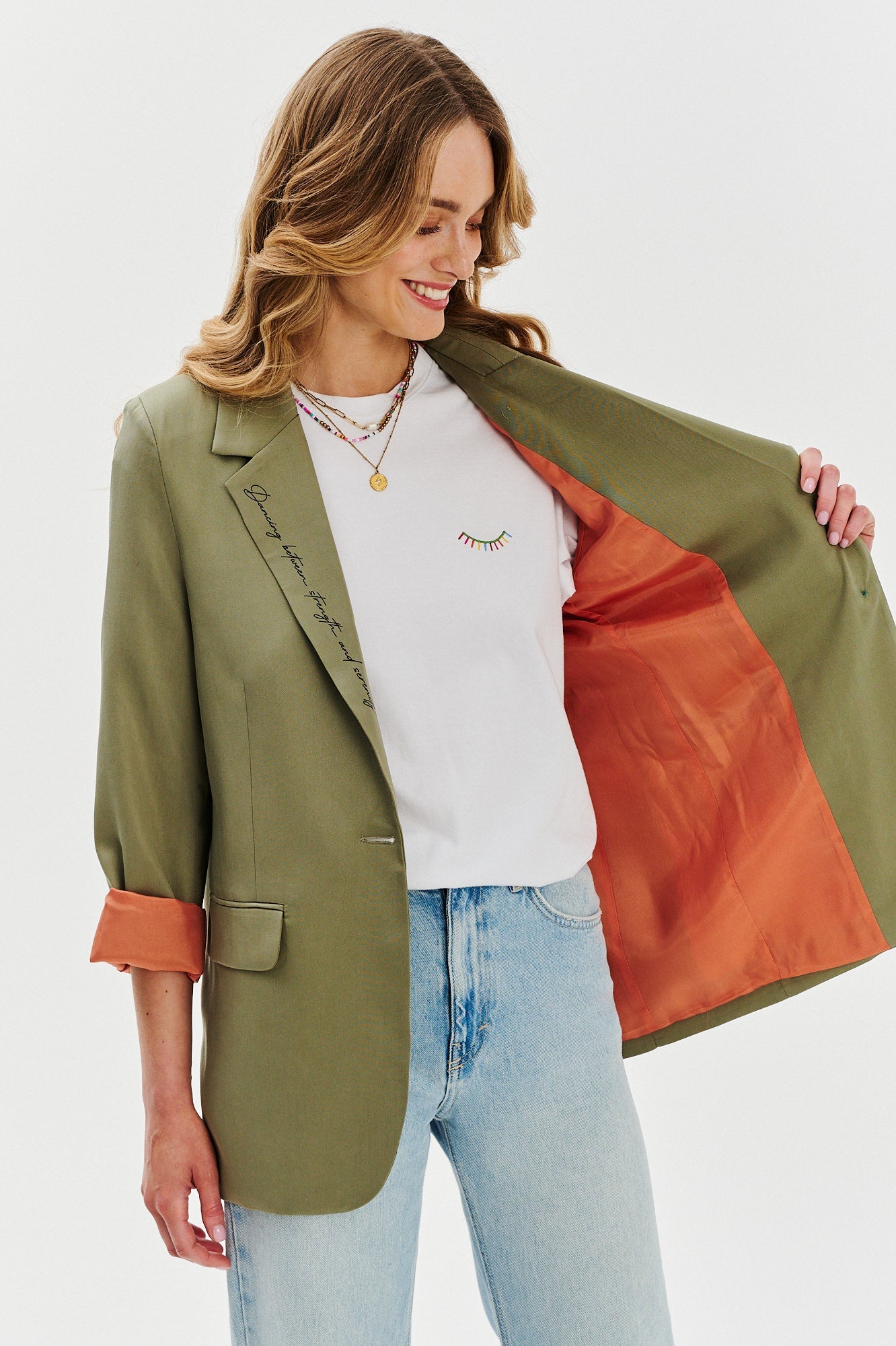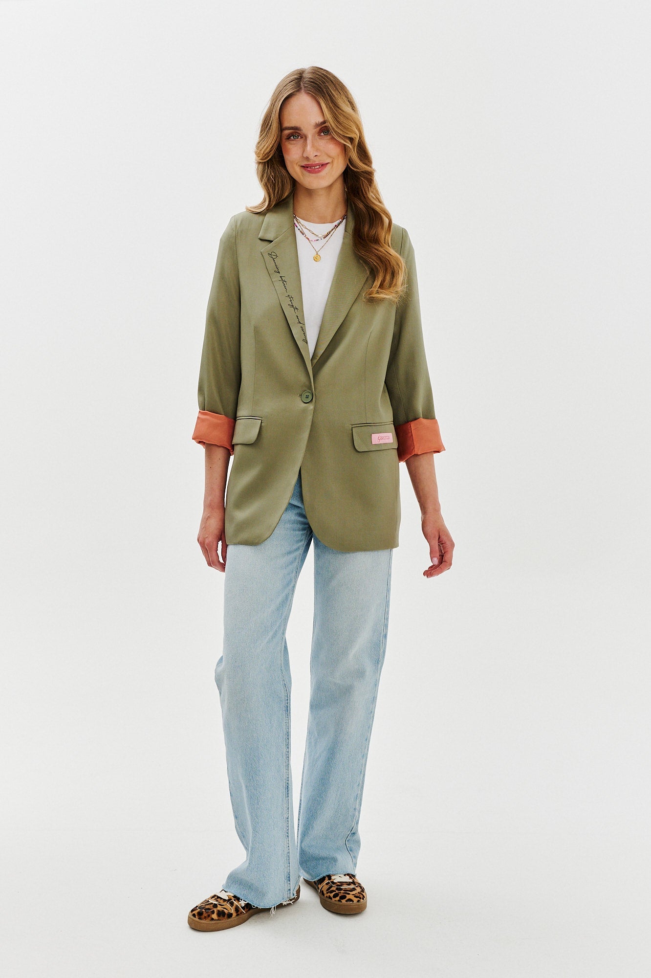 When classic form meets a sophisticated color palette - something special is created. Serenity Rose jacket is the epitome of calm and subtle strength. Deep green broken by peach interior and trims creates a duo that attracts the eyes and soothes the senses.