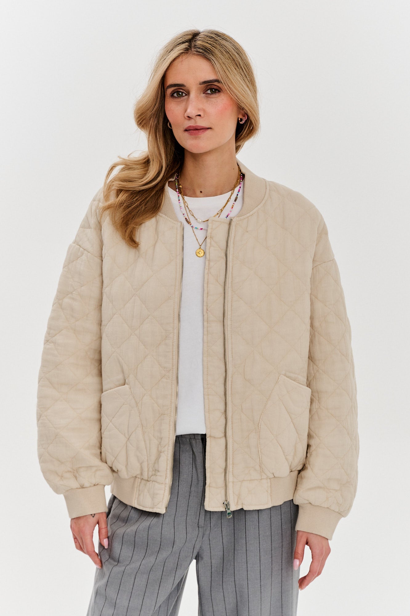 Shades of Dusk quilted bomber jacket combines classic and stylish! It is a timeless cut in a classic beige shade that adds style and feminine charm to any outfit. Made of soft fabric, it provides comfortable wear, while the button closure adds an elegant touch.
