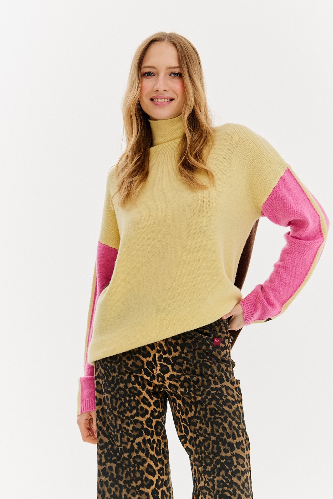 Shine Bright wool turtleneck sweater is a subtle yet distinctive piece of clothing that will enchant you with its unique color combination and extremely pleasant-to-touch finish. This model impresses with its contrasting colors and their combination: pink, yellow, and brown, which perfectly break up the main color of the sweater and give it a fresh look. The thick, elastic fabric makes the turtleneck perfectly hug the figure, ensuring comfort even on the coldest days. The high collar will protect you from the wind, and the distinctive seams and pastel details give the sweater a modern character.