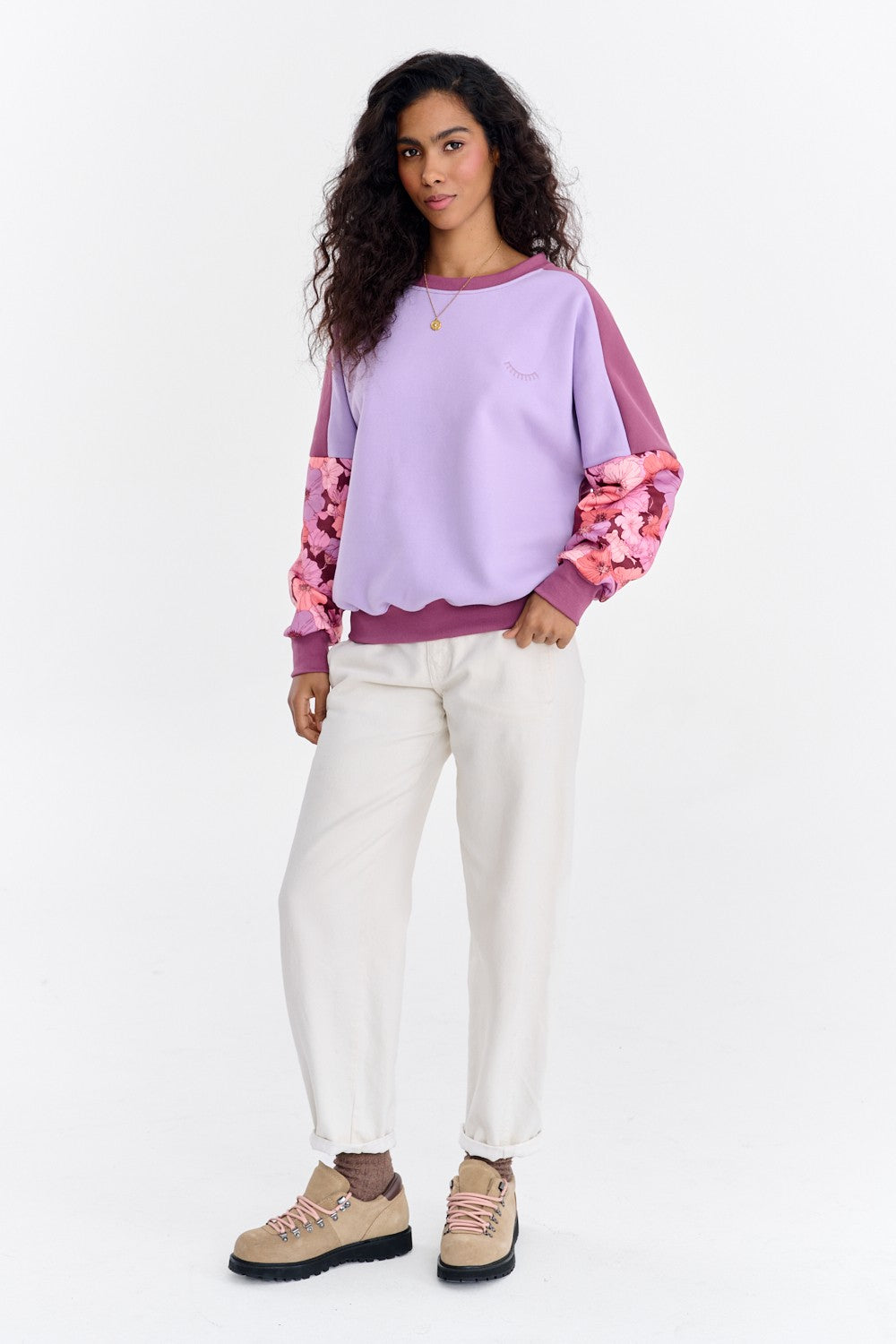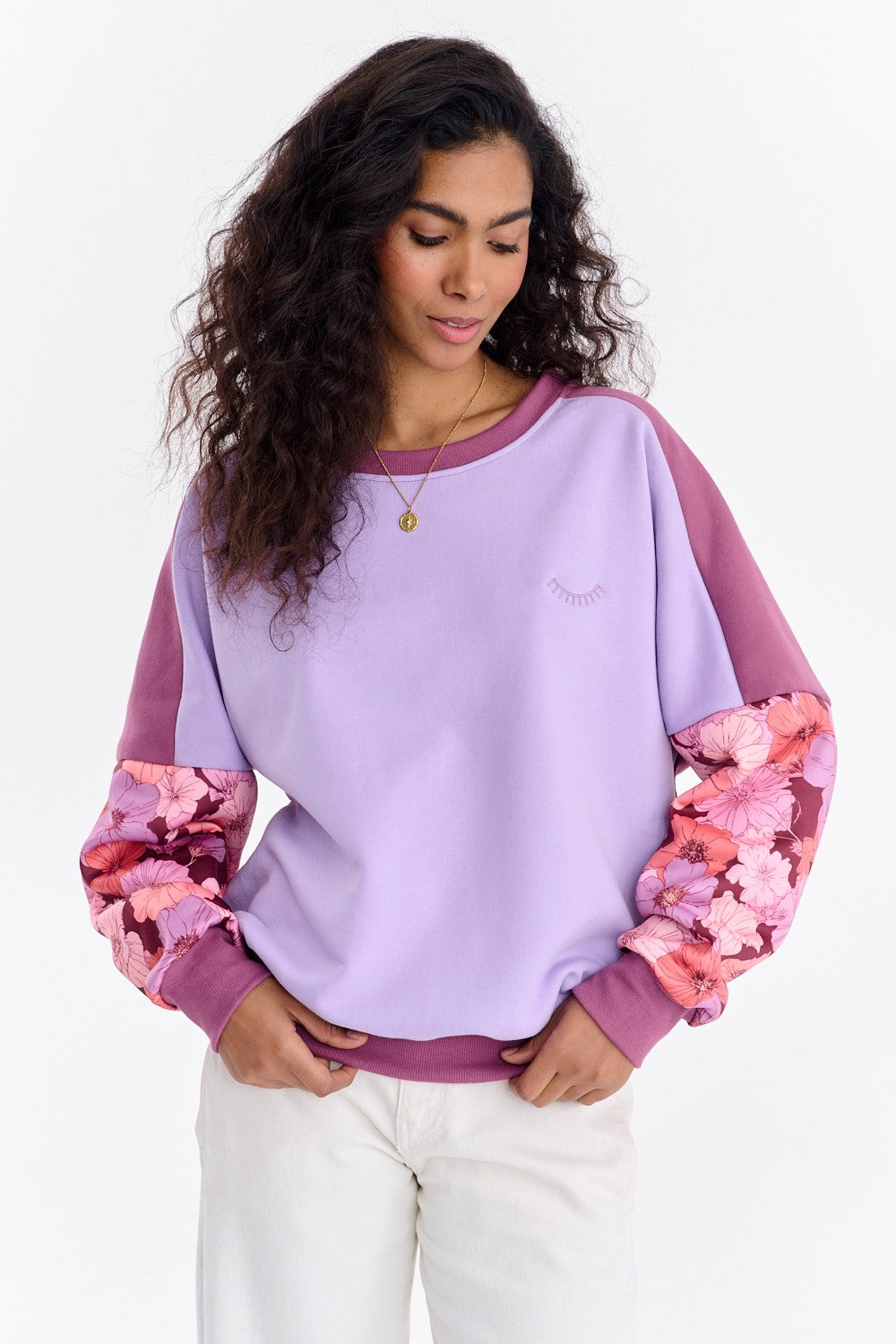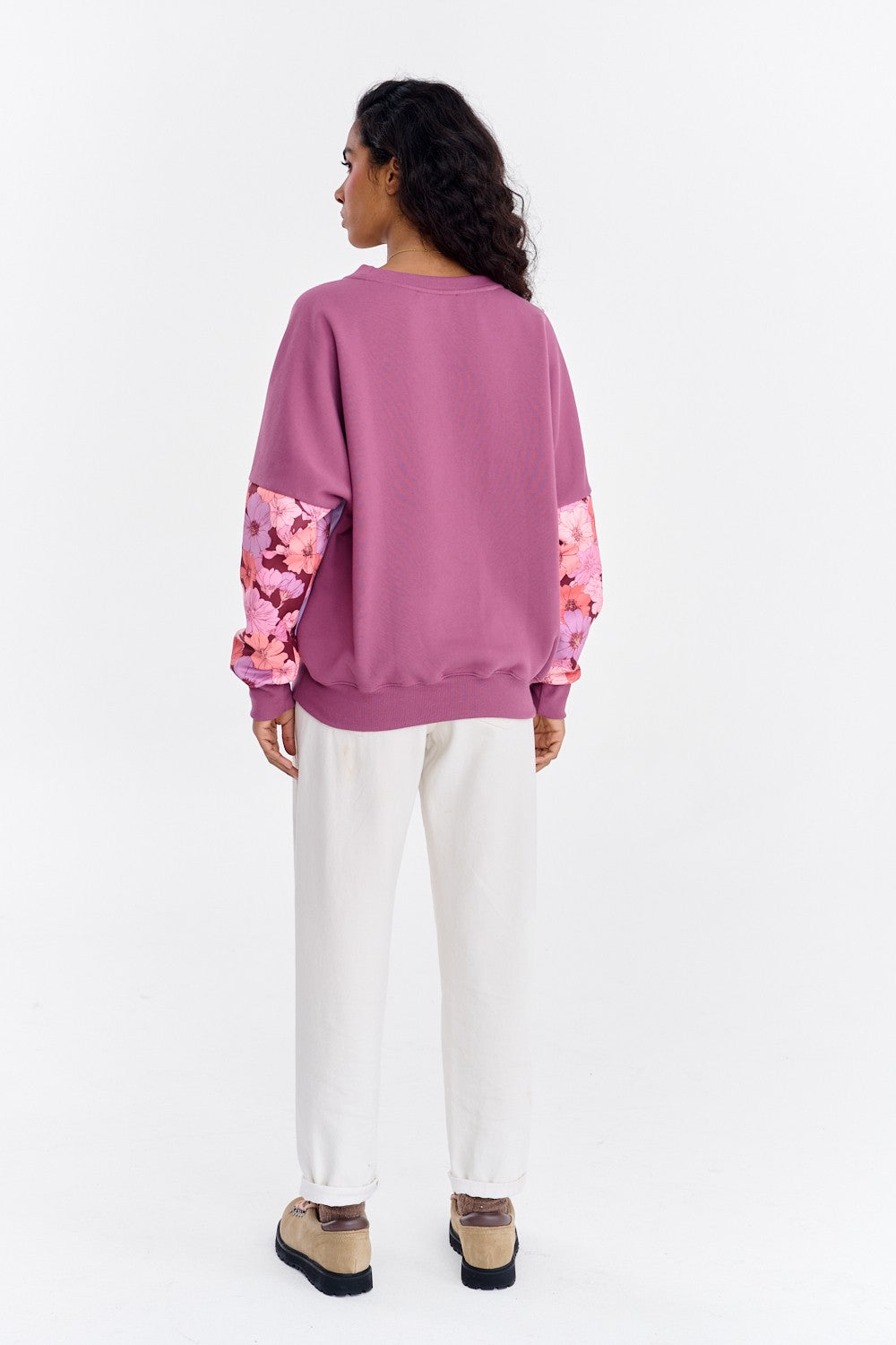 The Soft Blooming Sweatshirt is a model for women who love unique combinations. The sweatshirt's base is based on the color-blocking principle, combining pastel purple with a deeper, burgundy shade on the sleeves and cuffs. The real highlight, however, are the sleeves, covered with a beautiful floral print.
