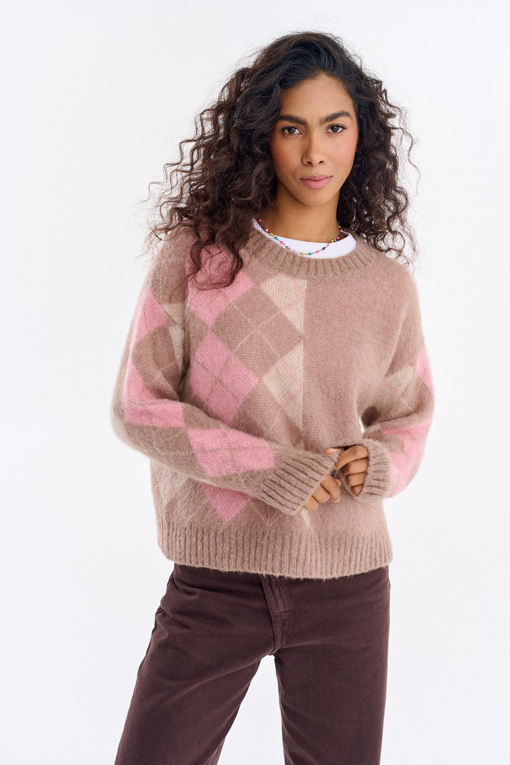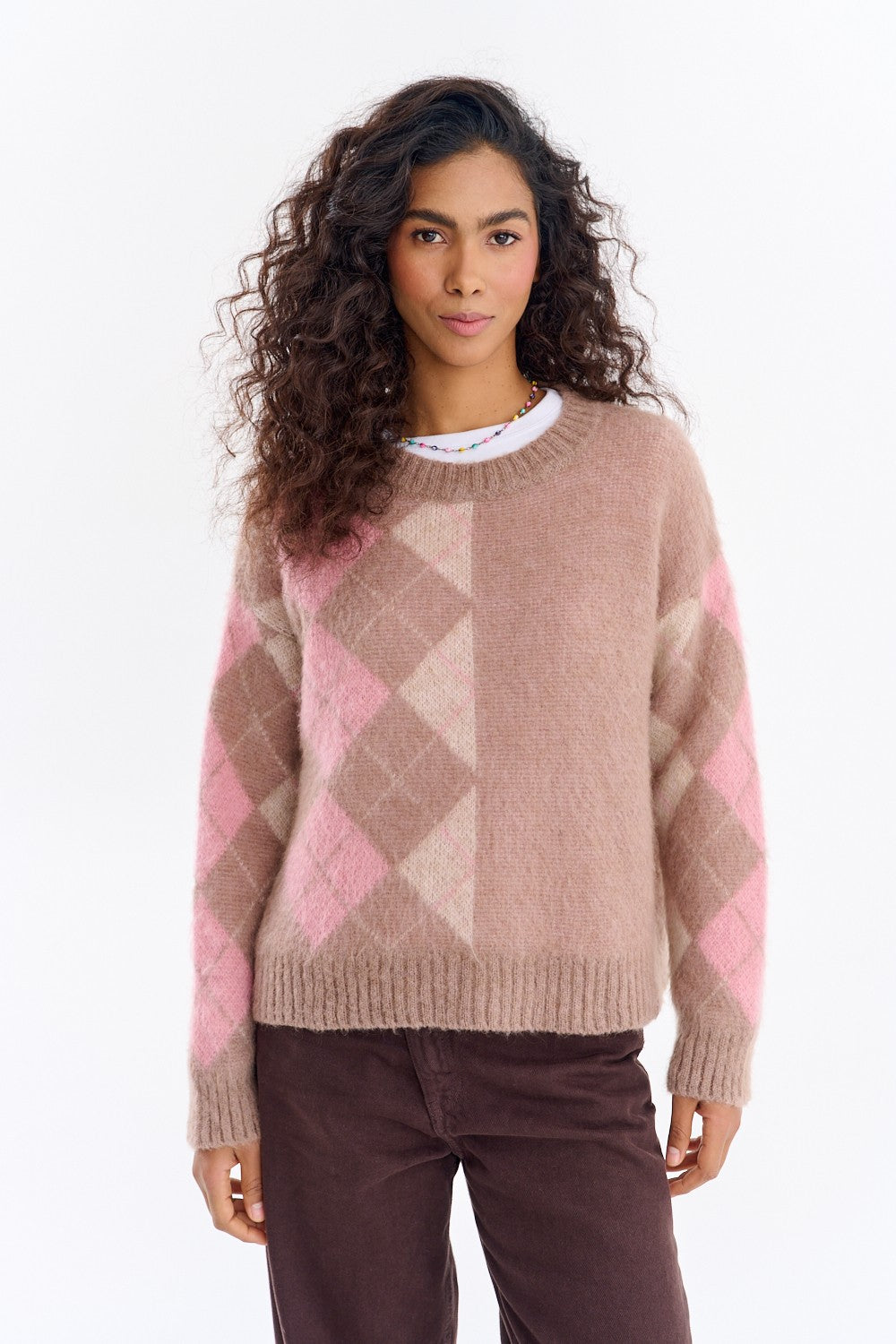 The Softspoken mohair sweater is the perfect companion for any fan of the "dark academia" style. It delights with a classic diamond pattern in muted brown and pink colors. The asymmetrical pattern on the front gives it a modern touch.
