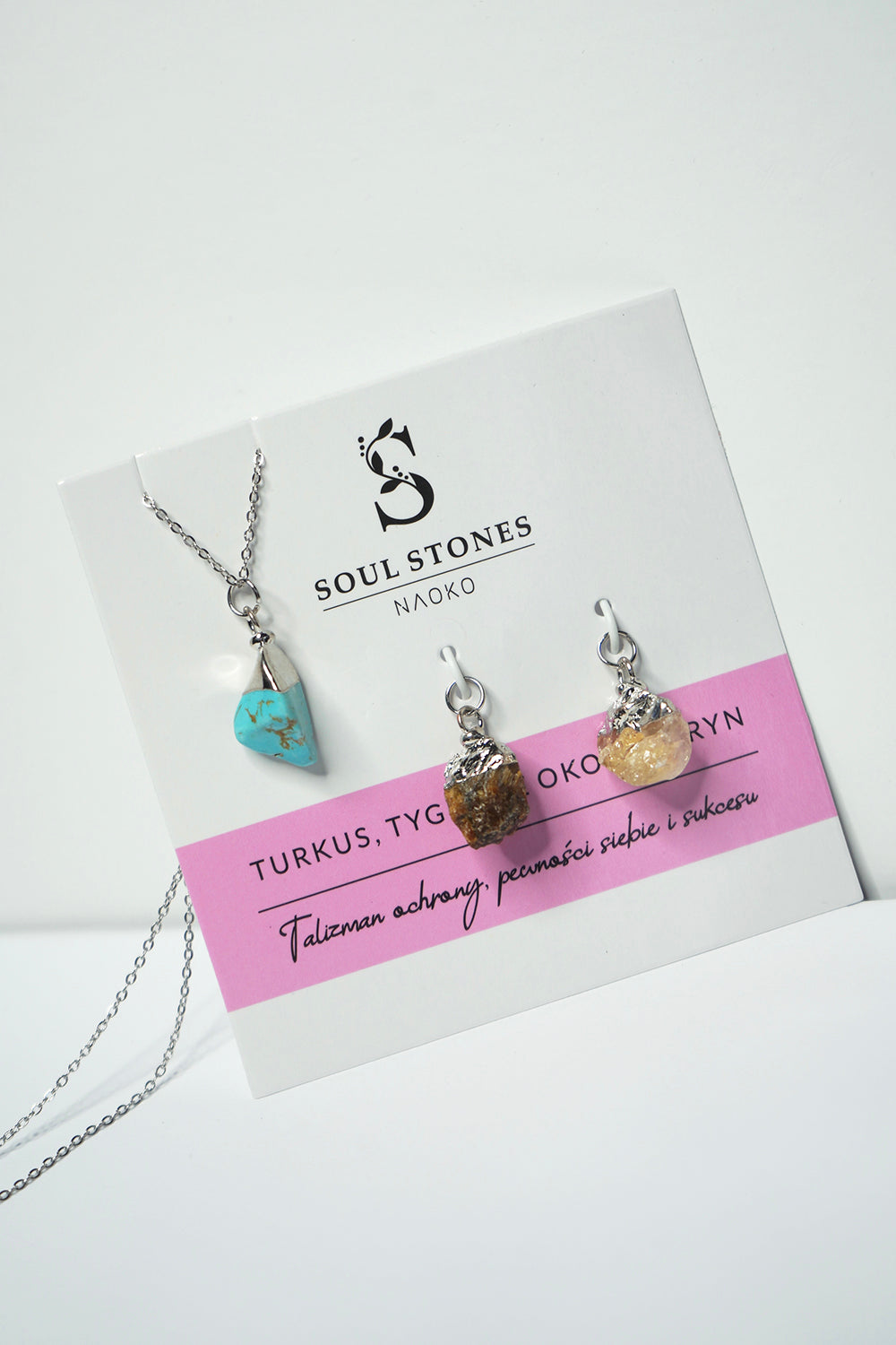 The Soul Stones Glow necklace in silver is the essence of strength and balance, encapsulated in three unique stones: turquoise, tiger eye and citrine. Its energy supports every #naokogirl in daily challenges, reminding that strength and optimism are always within reach.