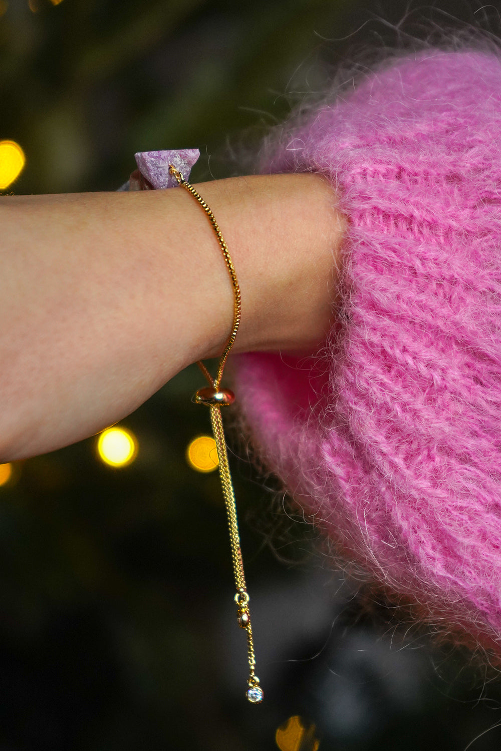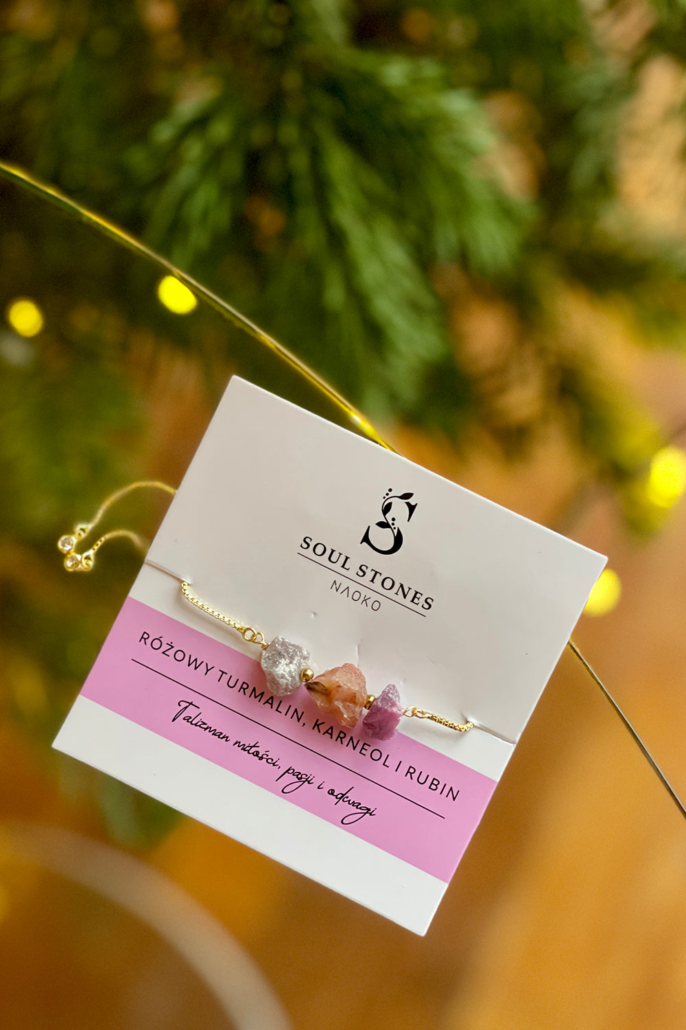 The Soul Stones Passion bracelet in gold color is a talisman that combines three extraordinary natural stones: pink tourmaline, carnelian and ruby. It comes in one size and is adjustable. Just move the metal bead to make it smaller or looser to fit you and your style perfectly. This is jewelry created for women who want to surround themselves with the energy of love, passion and strength every day.