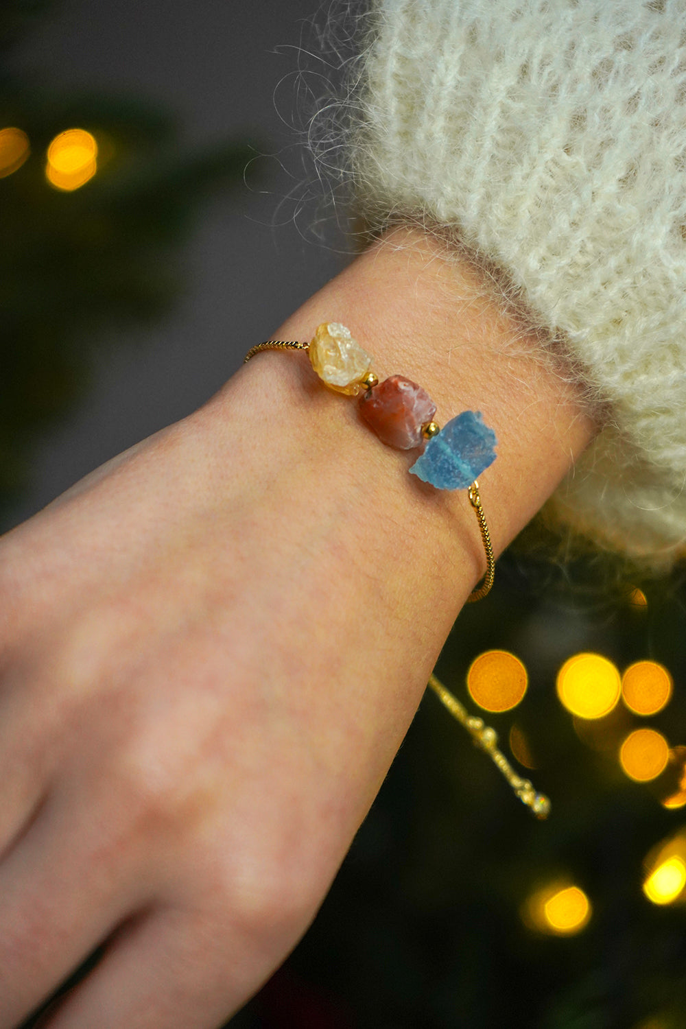 Discover the beauty and energy of nature encapsulated in the Soul Stones Vitality bracelet with citrine, carnelian and aquamarine in elegant gold color. This is a unique accessory that combines aesthetics with meaning. Citrine, known as the “stone of the sun,” symbolizes positive energy and abundance, adding confidence and brightening even the cloudiest days. Carnelian, with its deep red-orange hue, inspires action and awakens creativity. And aquamarine, with its soft blue glow, brings peace and harmony, helping to find balance in everyday life.
