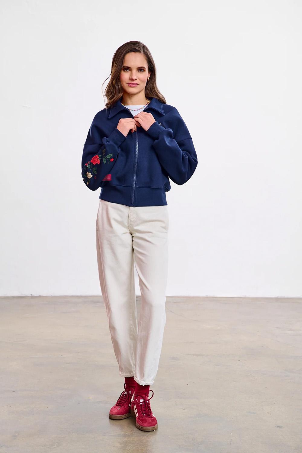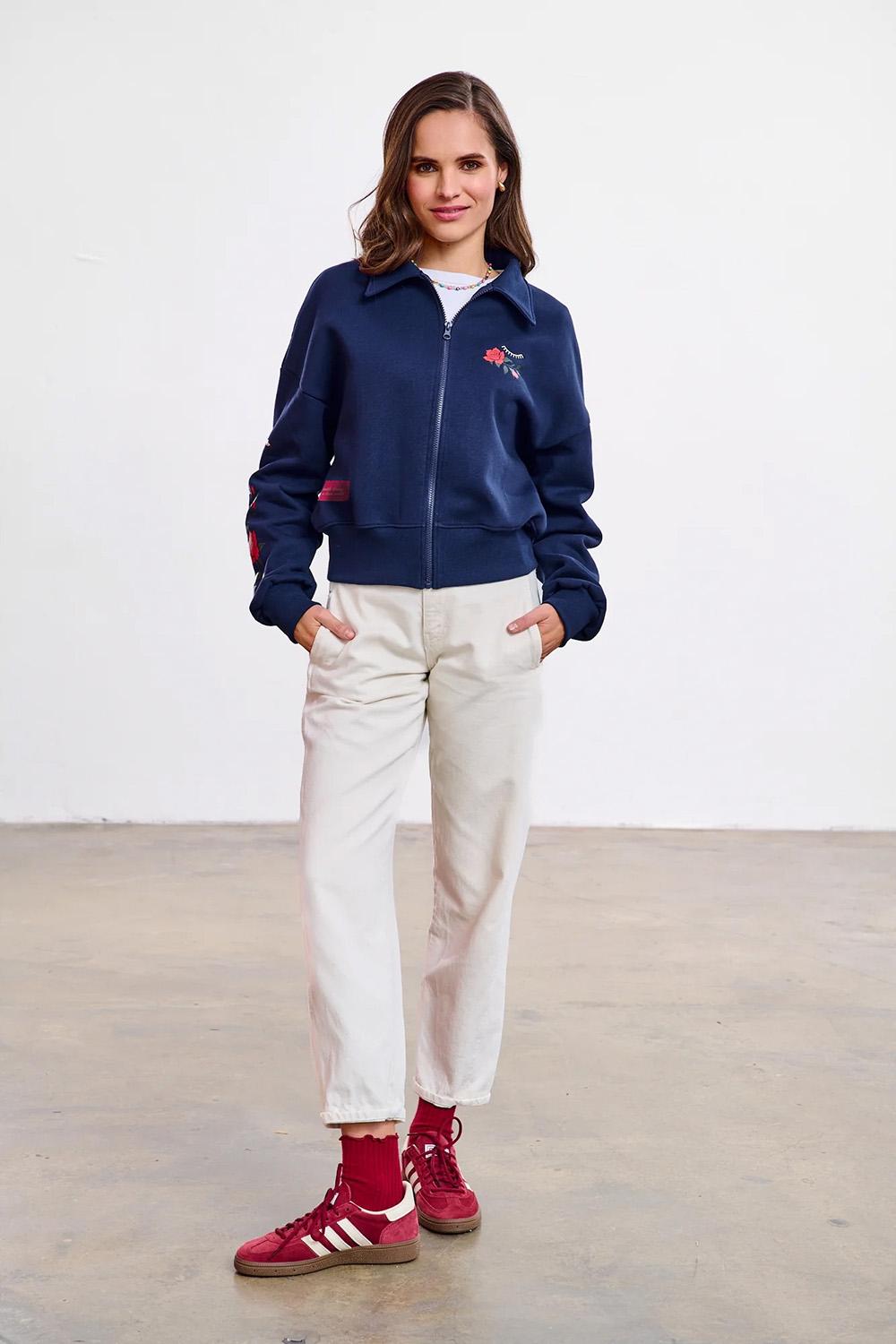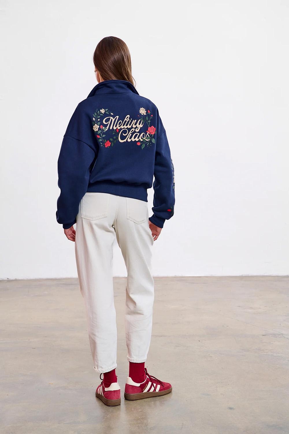 Melting Chaos Zip-Up Sweatshirt is a choice for women who enjoy combining romance with a touch of edge. The deep navy blue provides the perfect backdrop for intricate embellishments that catch the eye and give the piece a unique character.