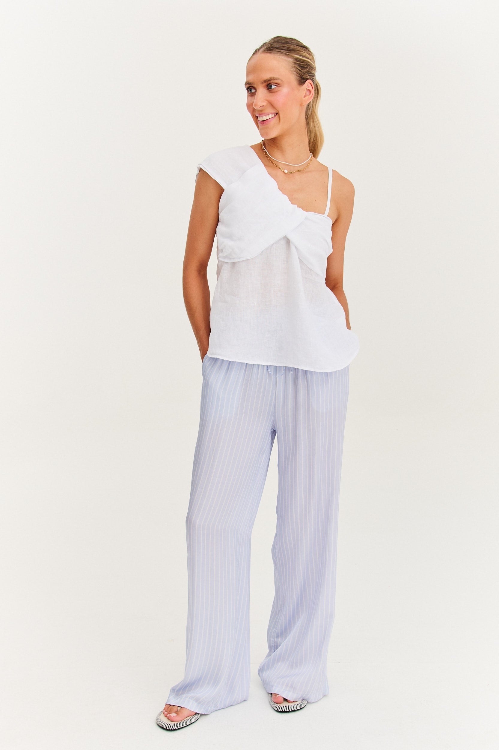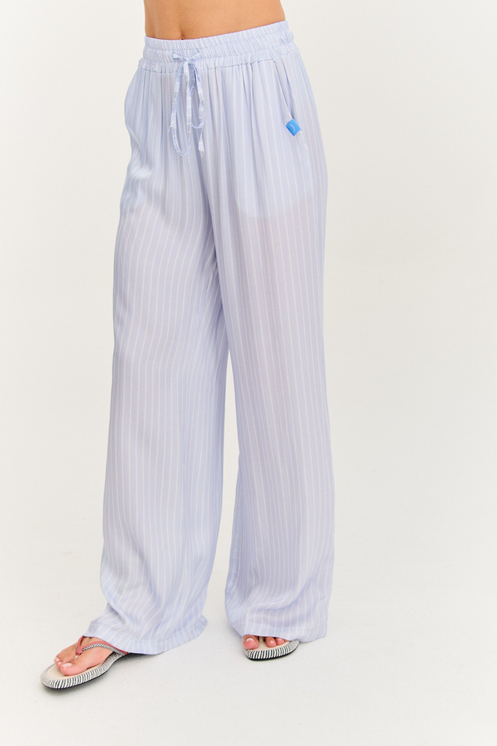 Storm Calm wide-leg trousers embody softness and ease with a touch of elegance. Their subtle shine and cloud-like blue stripes recall the peaceful sky after a summer storm – calm, cool, and effortlessly graceful.