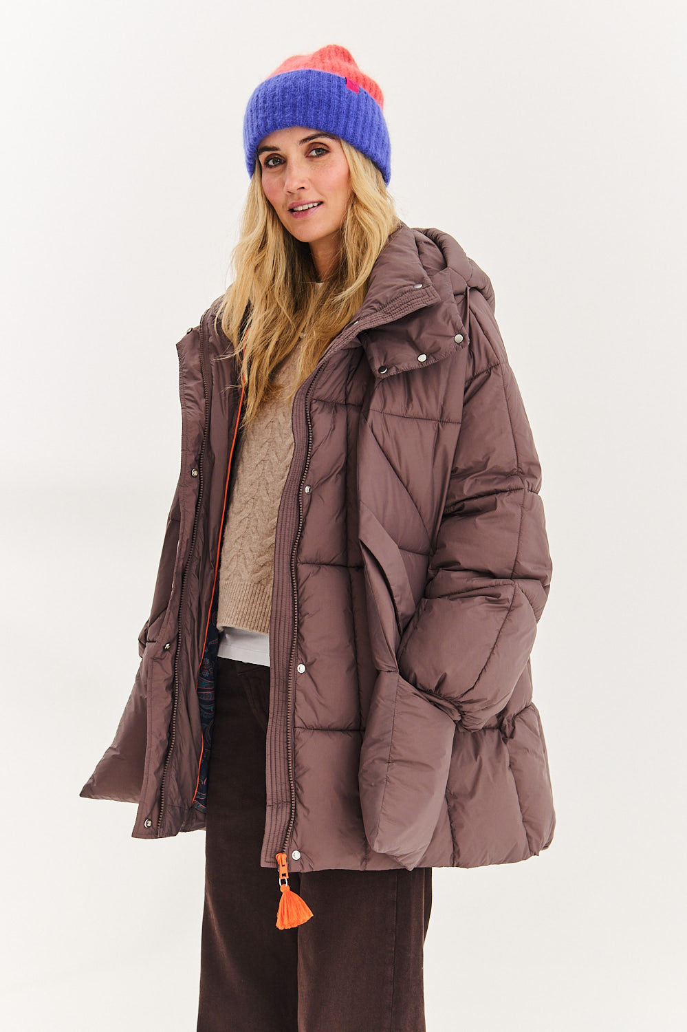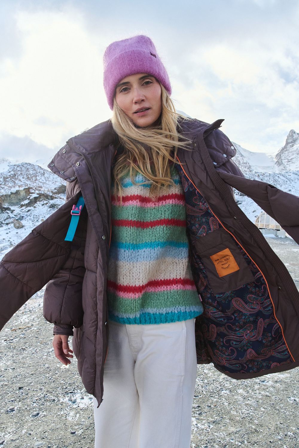 The Stormy Ethno Mirage jacket is more than a simple parka. It is a multifunctional garment that combines different textures and patterns. The deep brown color of the coat is broken with an inner detachable paisley pattern panel.