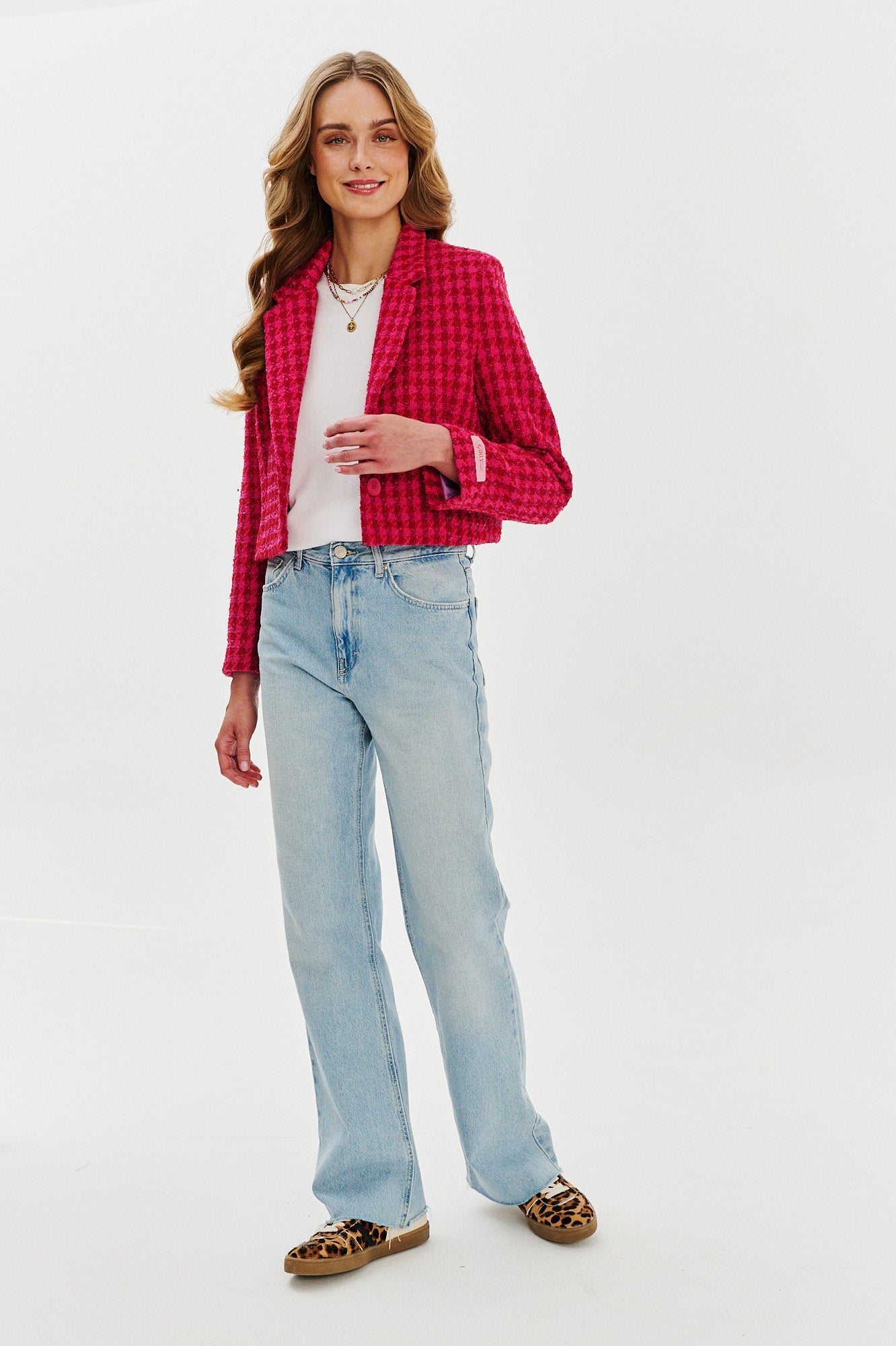 Sugar Rush short jacket - pink energy in an elegant way! Immerse yourself in the world of stylish sweetness! This model is a tribute to boldness in fashion - intense pink pepit meets classic cut, creating a duo that is hard to miss. The jacket is made of tweed material.