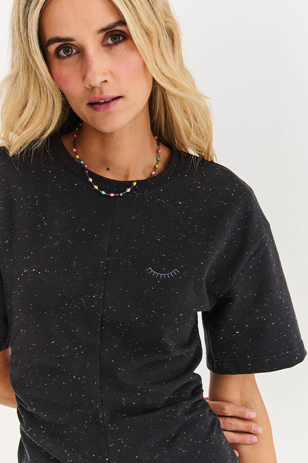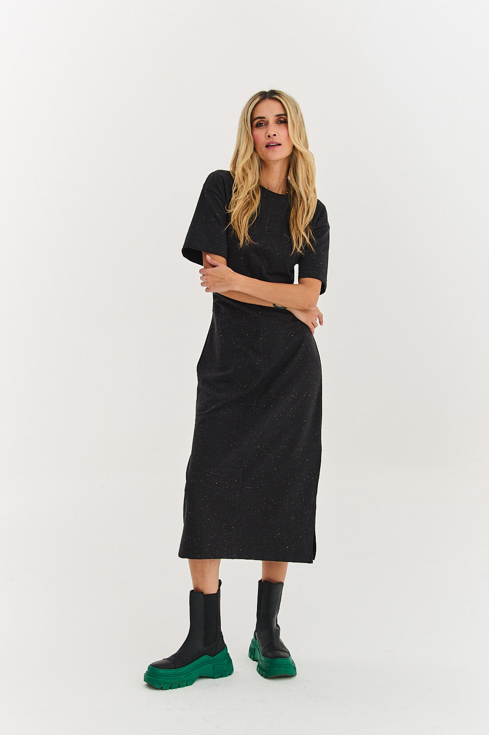 Lost Nomad dress is the definition of urban comfort. This model is an extended form of a midi length T-shirt, made of a unique sweatshirt knit. The dark graphite melange is enlivened with colorful neon flecks, which gives it character.