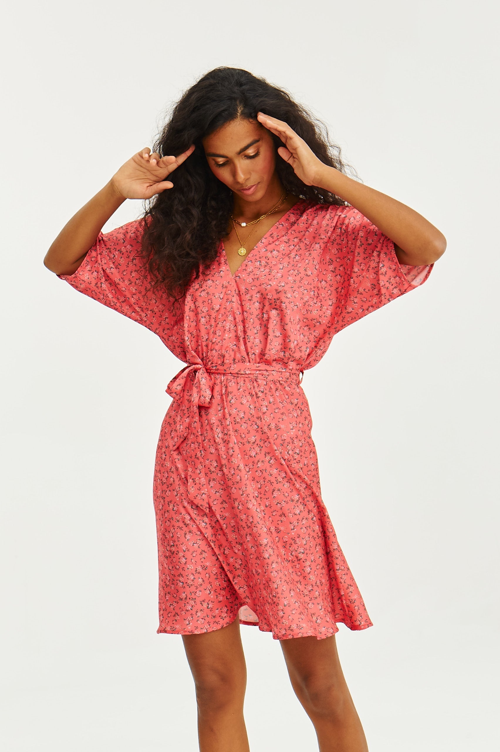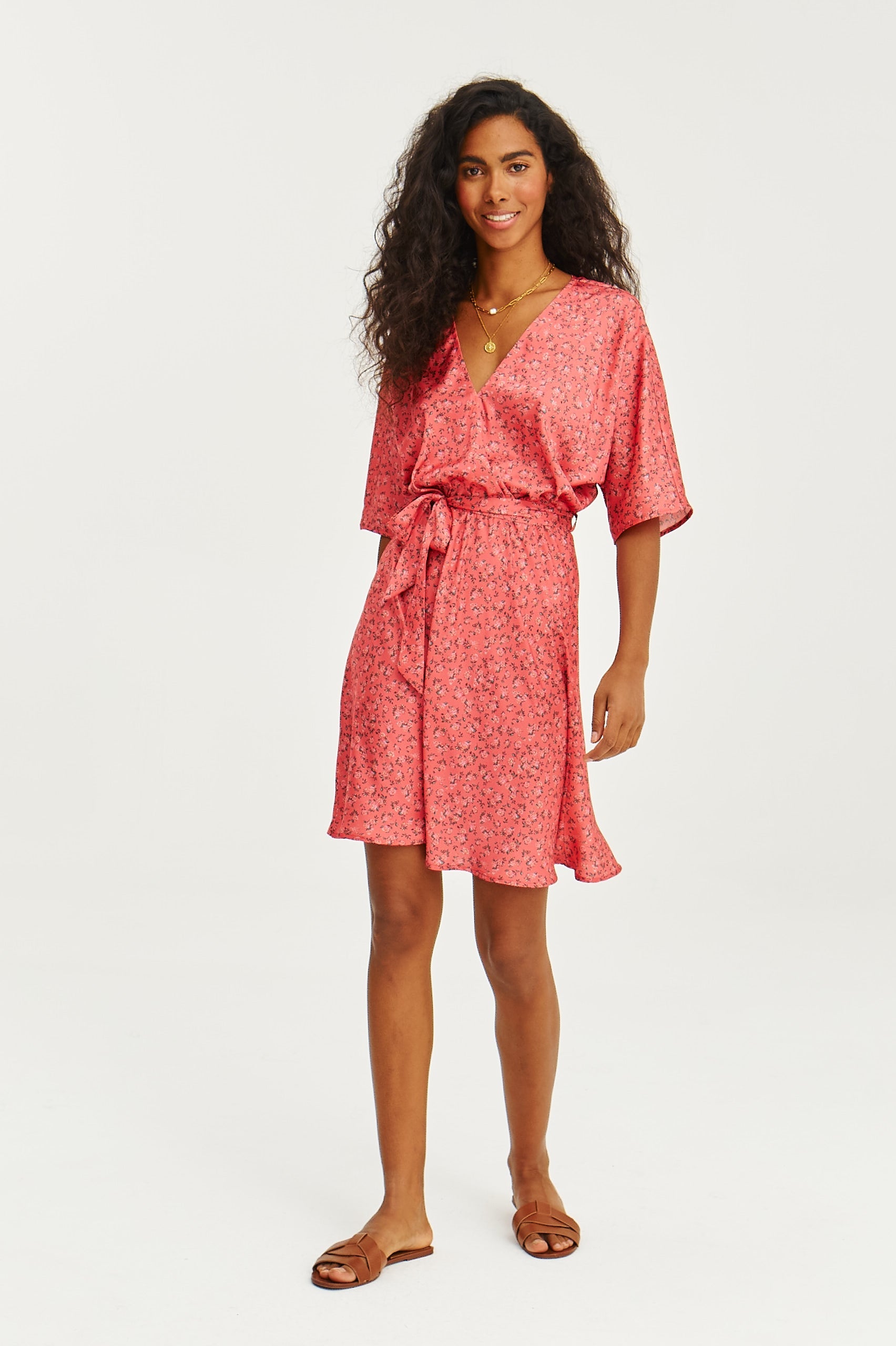 If you are looking for a dress that will be with you from the first ray of spring to the last summer evenings - you have just found it. Sweet Rosalia mini dress is a nod to feminine freedom and subtle romance. Designed in lightweight viscose, with a fine floral print on a coral background, it catches the eye, but remains delicate and unforced.