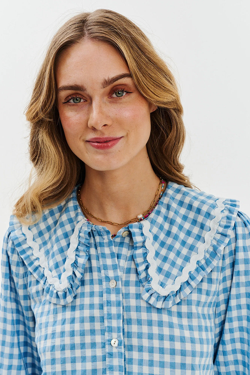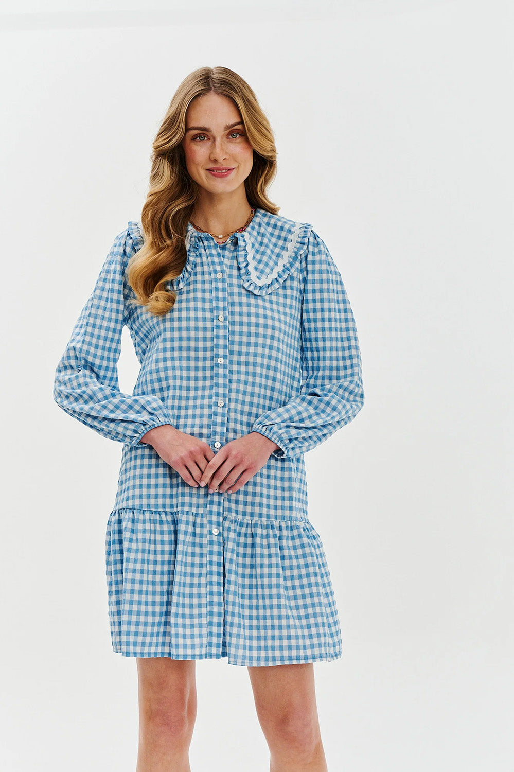Sweet Storm dress is the perfect combination of nostalgia and modernity. The classic baby doll cut with a flared bottom and a delicate checkered pattern in a shade of pastel blue creates a base that delights with subtlety. Attention is drawn to the decorative collar with a frill and white ribbon - a detail that wins hearts and adds a romantic touch to the whole.
