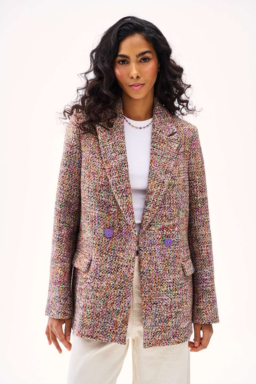 The Sweet Strategy blazer catches the eye with its richly textured fabric. A mix of colorful threads creates a mosaic that shimmers with every movement, while the purple lining adds a luxurious touch.