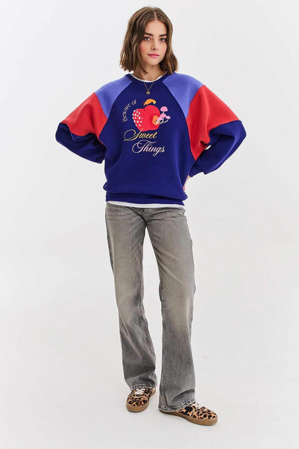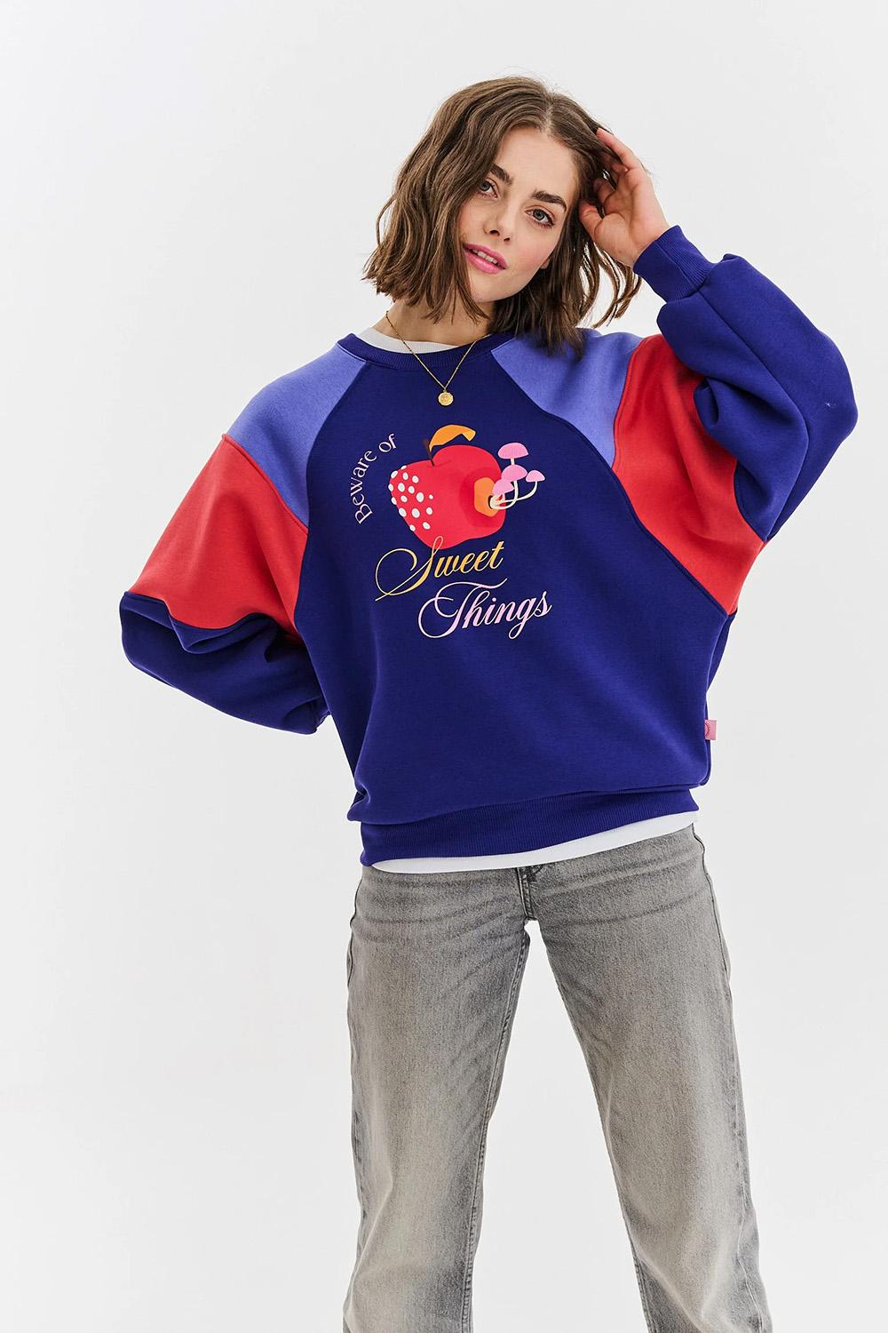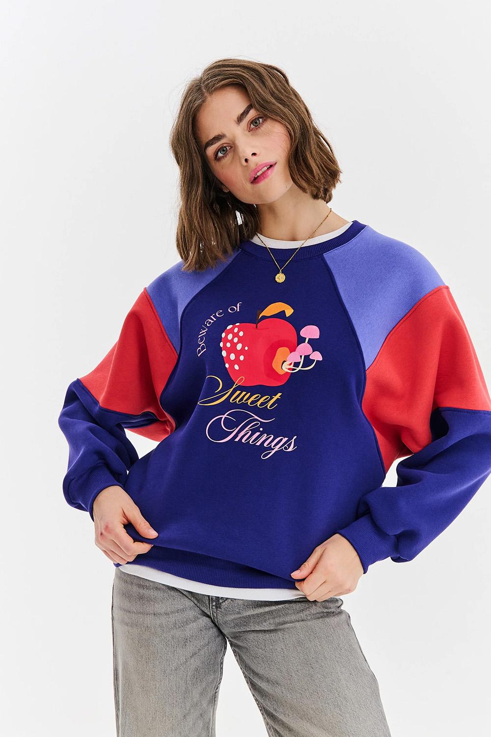 Sweet Things sweatshirt is the quintessence of joyful and relaxed style. Its design is based on the trendy technique of color blocking, which gives it a retro character. The focal point is a charming print featuring a strawberry and the words "In search of Sweet Things".